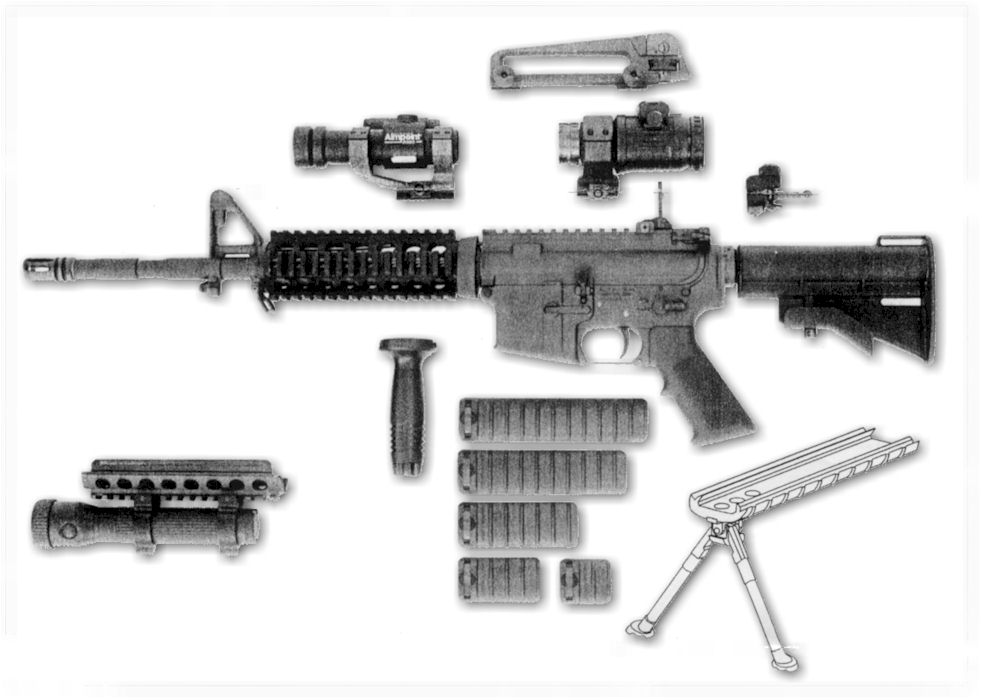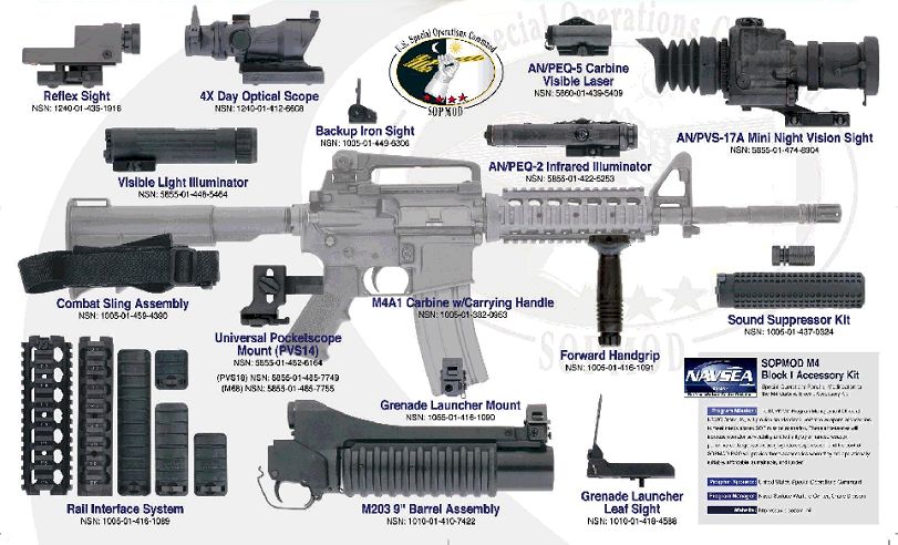 如下图所示,SOPMOD计划是由USSOCOM、海军特种作战部队、空军、陆军海军等其他特种部队共同提出,并委托NSWC(海军武器研究中心)负责研究的。1999年5月开始在海军和空军提供以M4A1卡宾枪为武器平台的SOPMOD进行试验。注意,这种称为SOPMOD M4的系统在NSWC的计划中仅是称之为SOPMOD Block 1。而SOPMOD Block 2则于2001年开展。