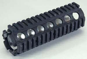 KAC生产的RIS护木是SOPMOD的重要部分,护木的上下左右各有一段M1913标准导轨,通过这些导轨装上各种战术附件,不装附件的时候也可以装上护木握片,使握持护木更舒适。在近战中可以装上前握把。