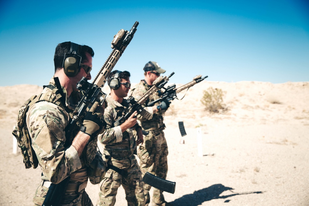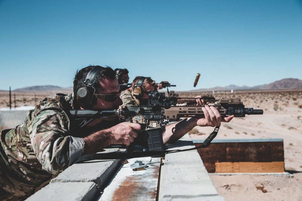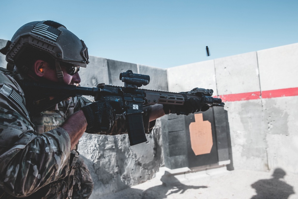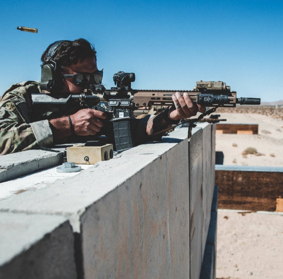 2019年10月18日,美国陆军第3特种大部在加州棕榈市的海军陆战队空中地面作战中心(MCAGCC)的训练场参加的联合战术演练中所使用的M4A1已经更换了URG-I
