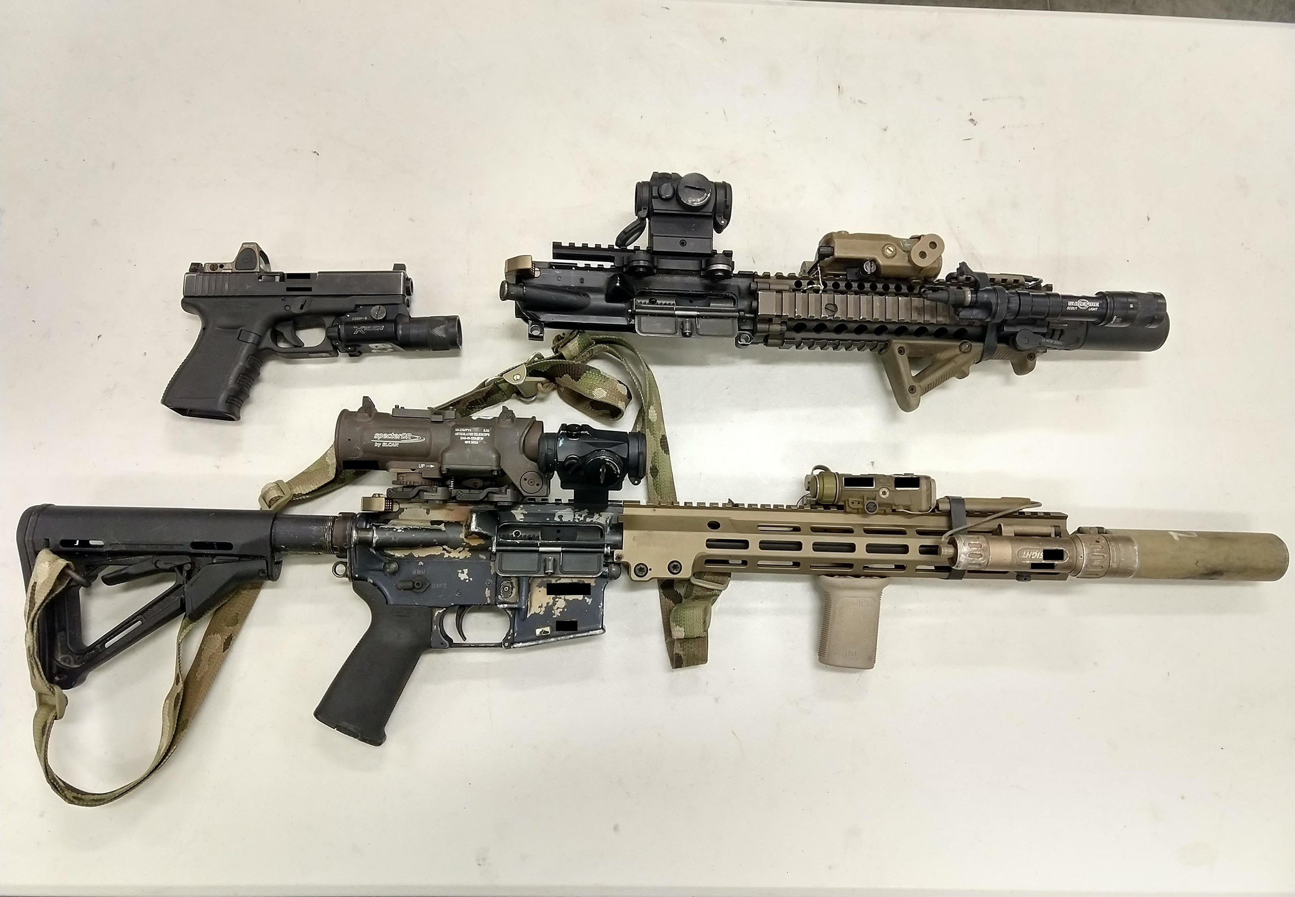 其实 陆军型和海军型的主要部件都是一致的:同样是DD枪管、Geissele护木,枪口安装SureFire的4叉型消焰器,并配SureFire SOCOM消声器,拉机柄 都是是Geissele公司的暗金色Airborne双面拉机柄,后备机械照门是Matech的,准星则是KAC的。陆军型和海军型不同的地方在于搭配的M-LOK配件 数量:陆军型是每一套配3个Magpul的7槽铝合金导轨及1套Magpul QD M-LOK背带环;而海军型则是2个Magpul的7槽铝合金导轨,1套Magpul QD M-LOK背带环,1个Magpul战术灯橡胶开关安装板、以及2片Geissele导轨护盖。