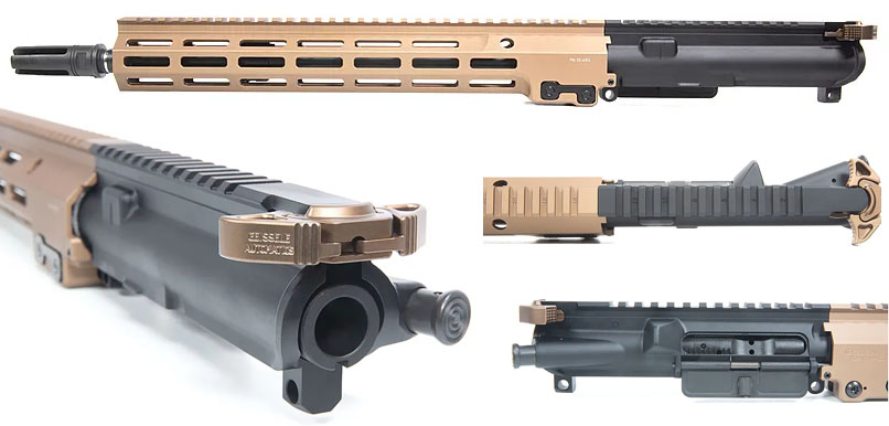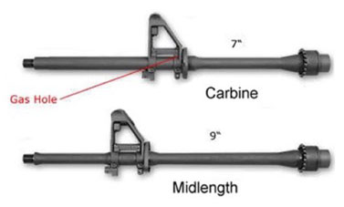 上面是传统14.5英寸M4枪管,导气箍后方的枪管长度是7英寸,下面就是中长导气的14.5英寸枪管,导气管后的枪管长度为9英寸
