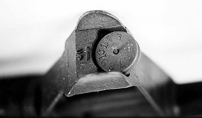 M16A1没有横风修正螺,调整风偏时要用枪弹的弹尖作为辅助工具。