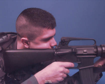 贴腮瞄准时,眼睛不能离照门太近或太远。如果太近,则觇孔过大,不容易把准星对准在中心位置;如果太远,则觇孔太小,不容易看清准星和目标。下图为正确的示范