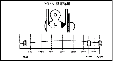 当使用大觇孔,为提高远距离上的命中率,可以将归零值定为25米,这样弹道在375米处就会重会。如果在近程射击中将归零调为42米,那么弹道就会在250米处重会。