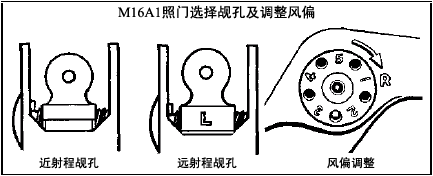 M16A1的照门由两个大小高低不同的觇孔和调整风偏的螺帽组成。
