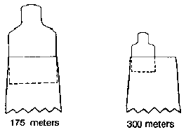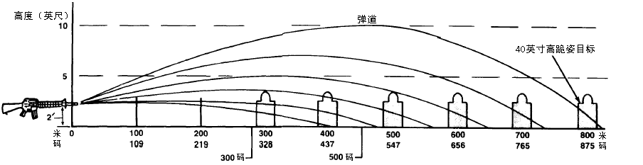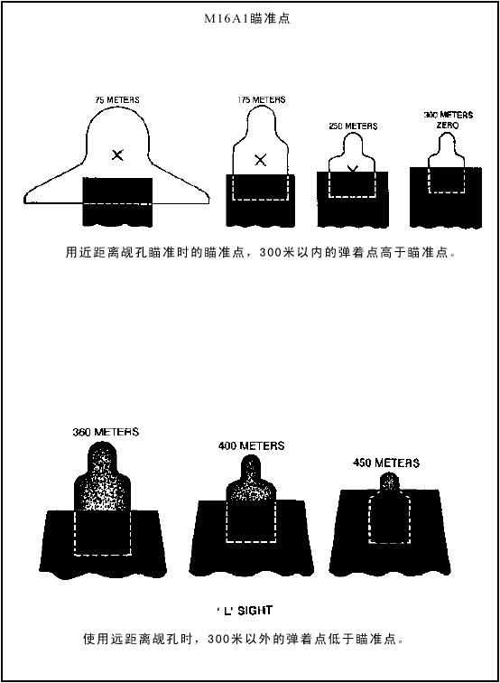 当使用小觇孔(显示“L”标志时),归零值为25米时,在225米处弹道是最高的,约为11英寸,而在375米处弹道与25米重会。