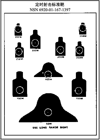 并非所有的地方都有设施完备的远射程靶场,因此在条件不足的情况下,美军会使用不同尺寸和形状的靶标模拟不同距离的靶标,下图为25米模拟板,靶下面的数字表示该形靶所模拟的射击距离,靶上的圆满点为模拟射击该距离目标时的瞄准点位置。