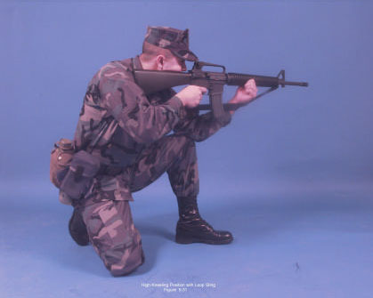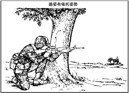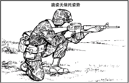 跪姿射击无依托射击是在士兵需要快速地从灌木丛后观察目标时提供一个稳定的射击姿势。非射击手由膝盖支撑。
