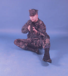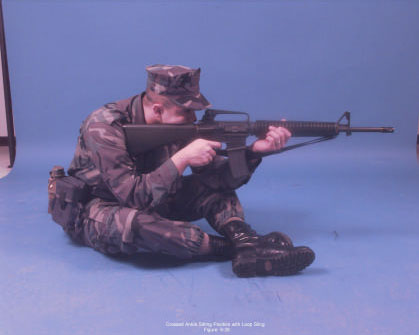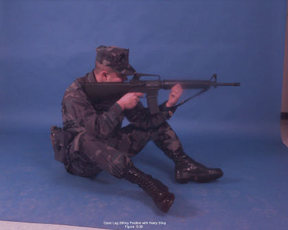 以下是几种坐姿射击的示范,坐姿适合在有一定高度的隐蔽物或掩体后的监视或射击目标,这个动作比较舒服,而且可以利用膝盖作为支撑,稳定步枪瞄准。采用何种姿势取决于隐蔽物或掩体的高度。