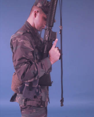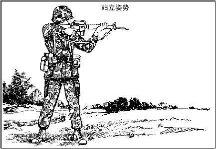 立姿射击时应该侧身面向目标,双脚分开,抵肩一边的手臂平举使肘部与肩部平行,非射击手可托在护木底部或弹匣的底部,枪托抵在上衣胸袋的边上,步枪的重量由肩部和非射击手一起承担。