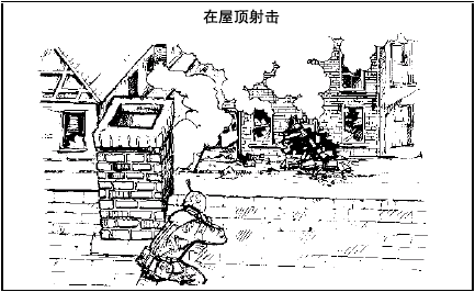 为观察范围更远以便下达指令,应该占领制高点。在屋顶上时也应注意减少暴露的身体面积,如上图所示可以利用烟囱来掩护。
