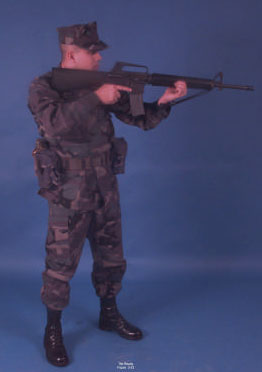 以预备姿势索敌,一旦发现敌情可以立即转换成瞄准射击的姿势。