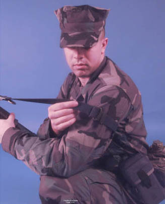 在海军陆战队的步枪手手册中,还有利用背带稳定步枪的技巧,使用步骤如下:把背带从枪托环上解下,背带的后半段缠绕在非射击手的上臂上,然后枪托抵肩,非射击手的手腕把背带撑开拉紧。(从左到右,从上到下)
