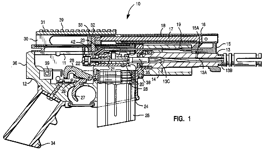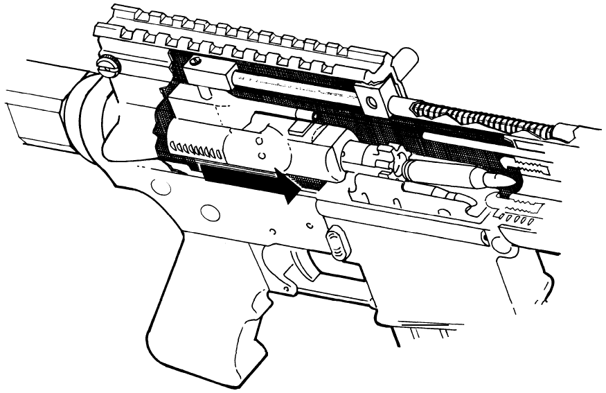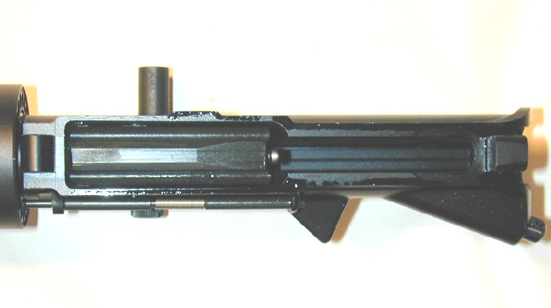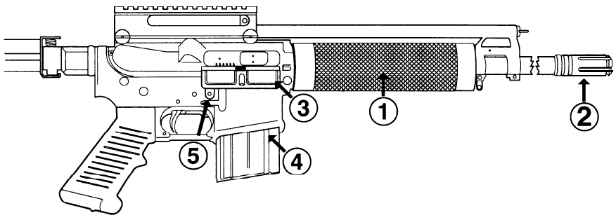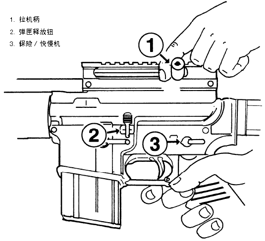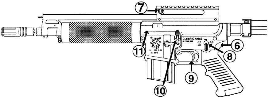 1-护木;2-消焰器;3-抛壳口防尘盖;4-弹匣;5-弹匣释放钮;6-机匣;7-拉机柄;8-快慢机;9-扳机;10-空仓挂机;11-枪机体。