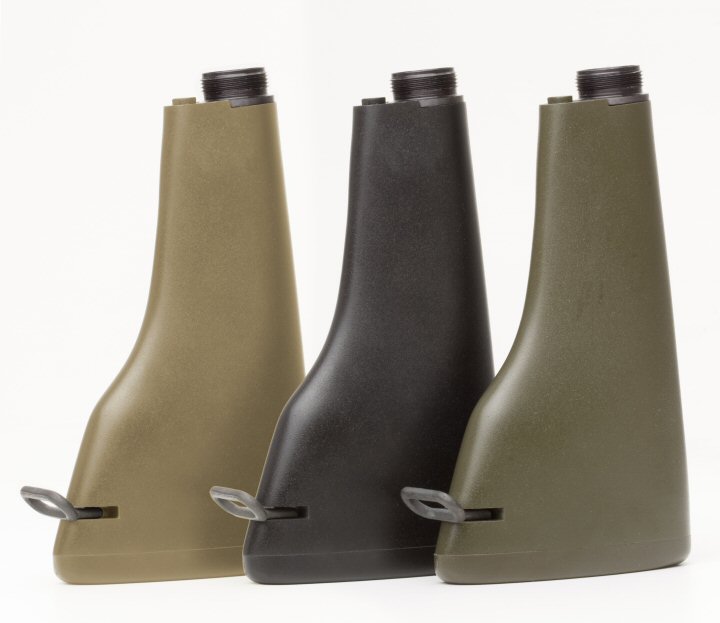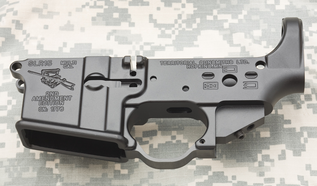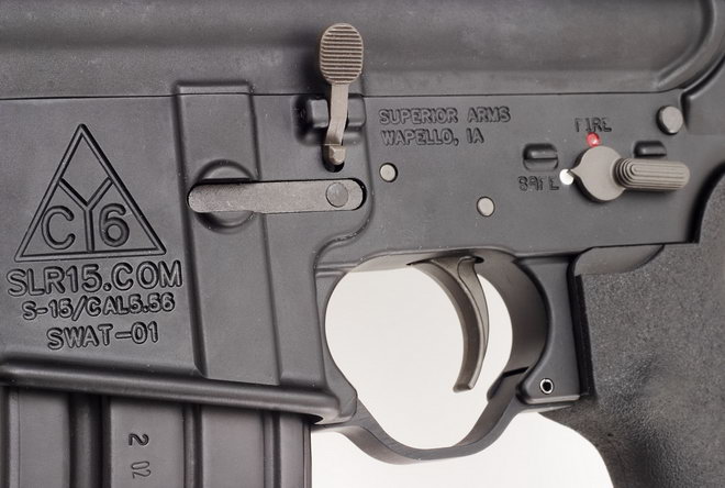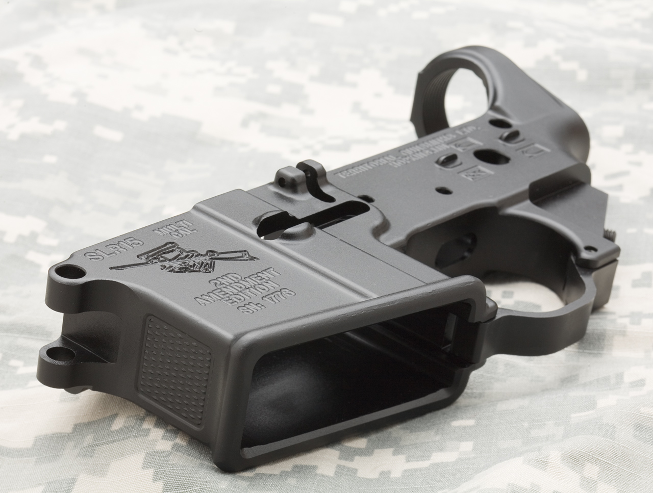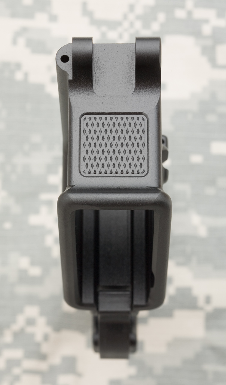 SLR15的下机匣,扩大的扳机护圈和弹匣座前方的防滑纹是其特色,防滑纹的作用是方便辅助手握持弹匣的位置