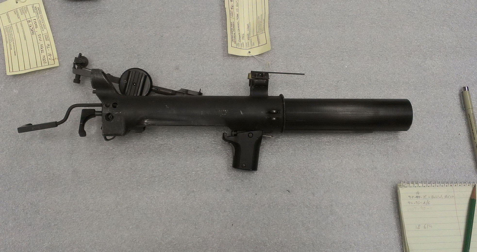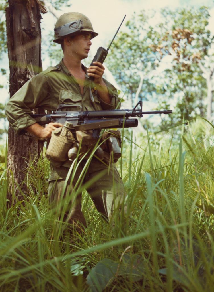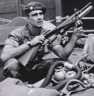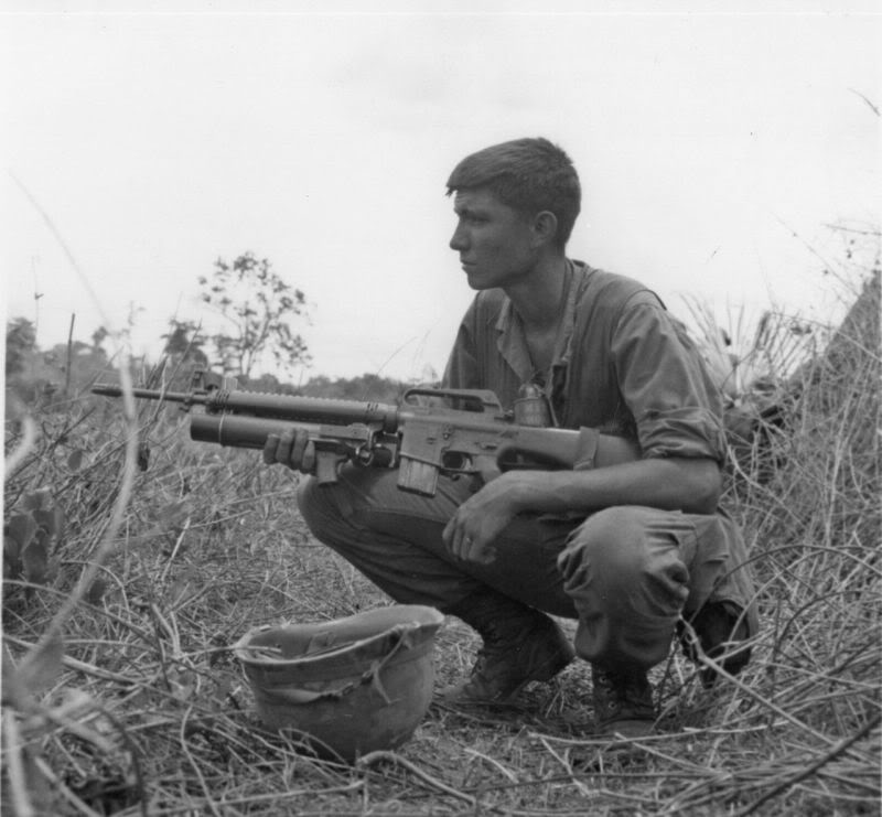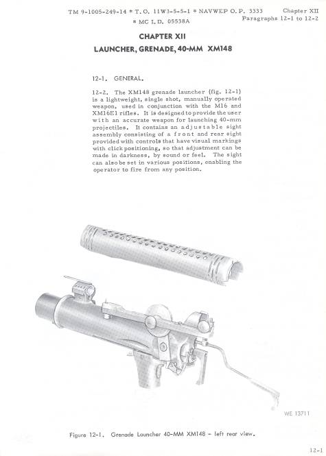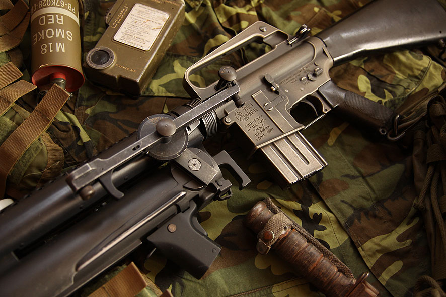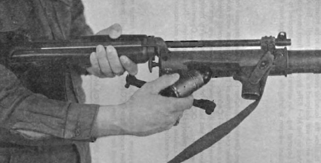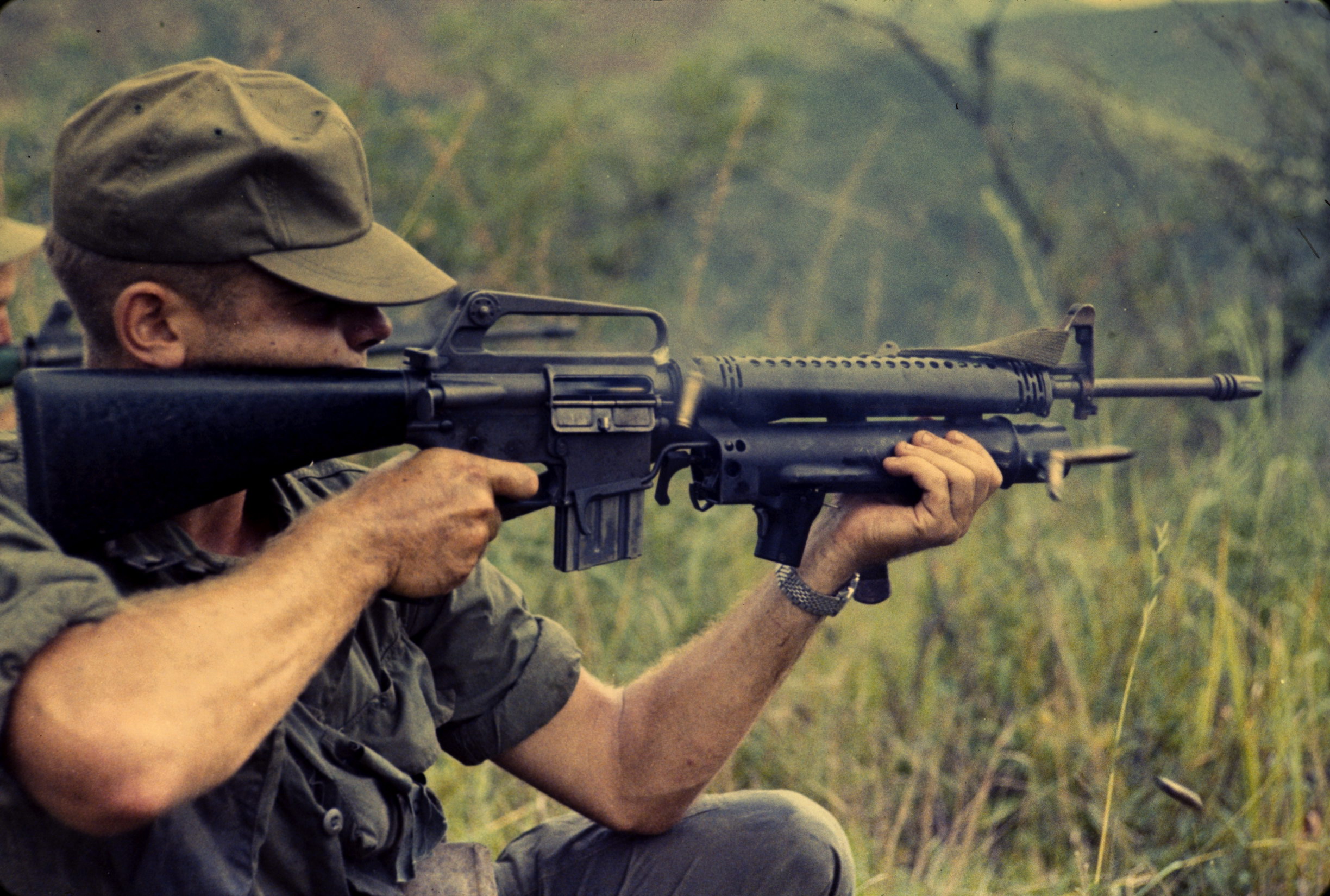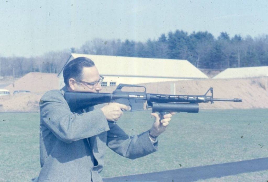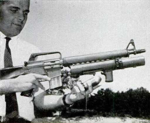1965年7月,柯尔特的工程师正在示范如何使用XM148,这是挂在605型CAR-15卡宾枪下