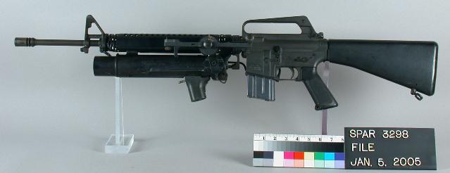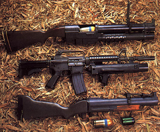 点面武器结合的概念其实是来自于SPIW计划,SPIW是“特种用途单兵武器”(Special Purpose Individual Weapon)的缩写,这个项目是打算研究一种全能的单兵战斗武器,但由于技术指标过于超前而不现实,因此SPIW项目浪费了大量的钱却无疾而终,但在SPIW的试验过程却发现在制式步枪上安装一个榴弹发射器的想法是可行的。基于这种设想,春田兵工厂和福特发动机公司都各自研制了一种枪挂式40mm发射器。