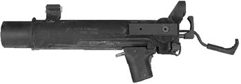 这种短短的前握把尾部是发射管锁扣,压下后才能向前推出发射管,装填榴弹