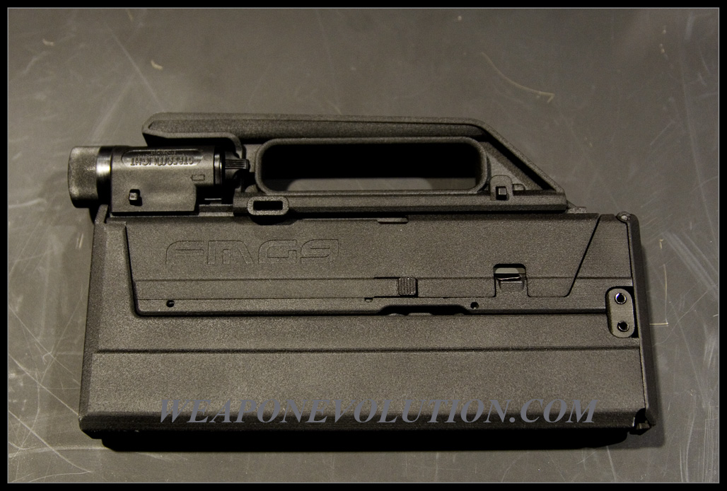 与Masada步枪一样,MagPul公司在FMG9上也是应用了现成的设计,本质上,这种折叠冲锋枪其实是在格洛克手枪上用一个塑料制的折叠外壳,不过虽然称为“FMG”(折叠冲锋枪的缩写),但目前原型用的是格洛克17的套筒。FMG9可配用所有格洛克手枪的9mm弹匣,包括30~33发的格洛克18弹匣。由于在各个角度的图片中都看不到有类似快慢机选择装置的物体,而从“冲锋枪”这个名称来看,我估计FMG9可能只能全自动射击。