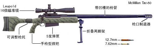 这5名加拿大狙击所使用的狙击步枪是麦克米兰公司生产的.50口径战术步枪(.50 CAL TACTICAL),又称为TAC-50。当美国陆军采用了巴雷特公司生产的M82A1 12.7mm步枪后,许多12.7mm民间比赛步枪便涌向军方市场,很多国家的军队也跟着采用了.50步枪用作反器材步枪或狙击步枪。加拿大军方在2000年4月采用了麦克米兰TAC-50,并命名为C15远程狙击武器系统(LRSW)。