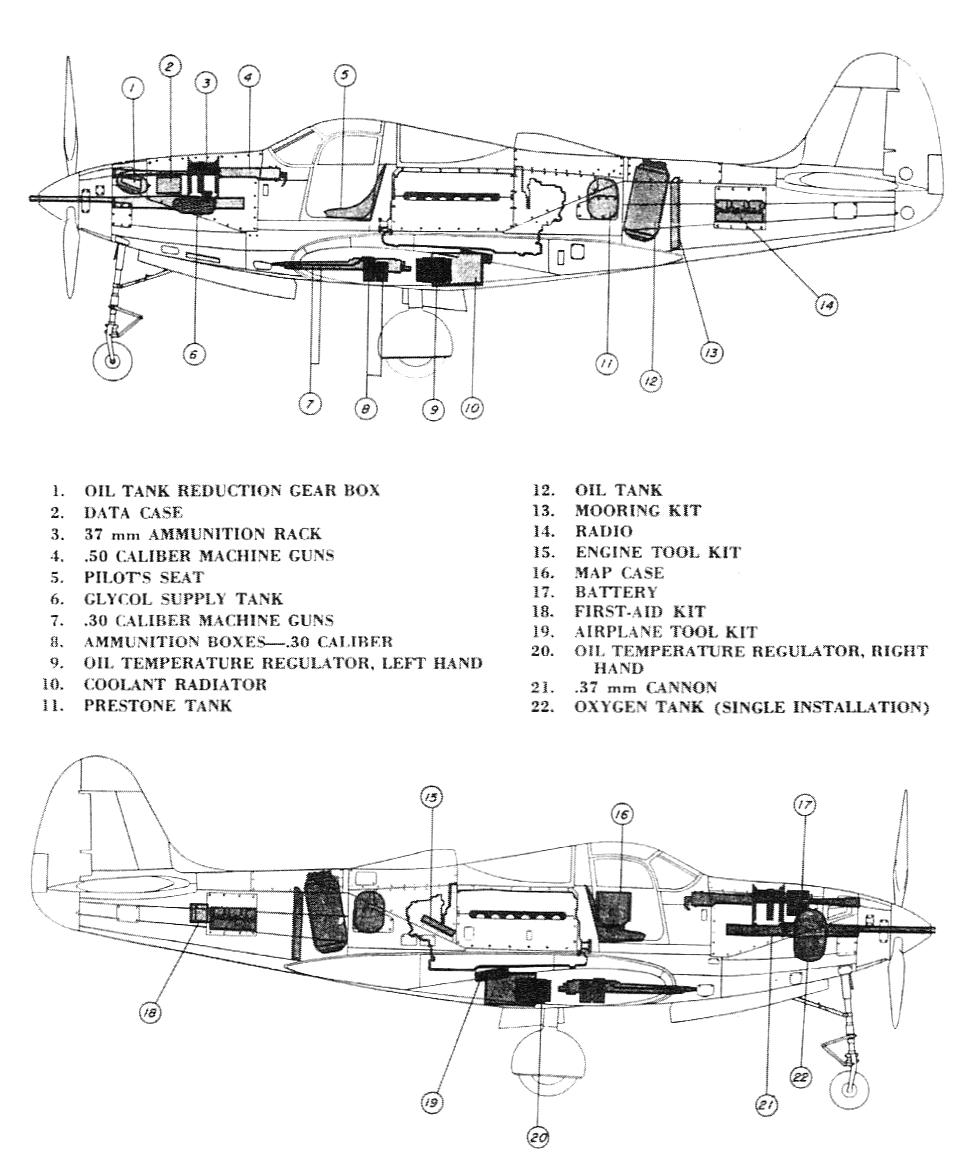 P-39战斗机上根据不同的型号分别有2挺或4挺M2机枪(前者为2挺机鼻上的同步机枪及4挺机翼上的.30机枪,后者机翼上改为2挺M2机枪)
