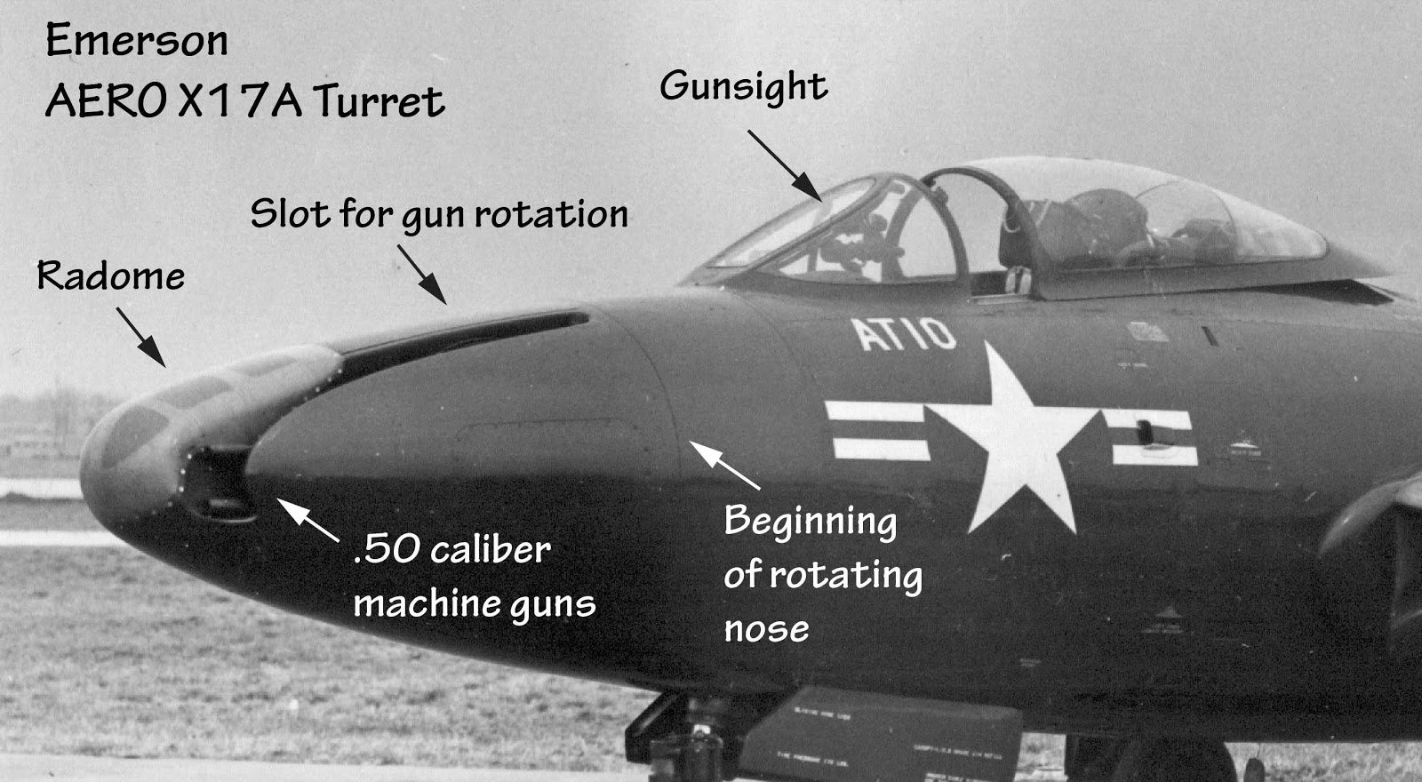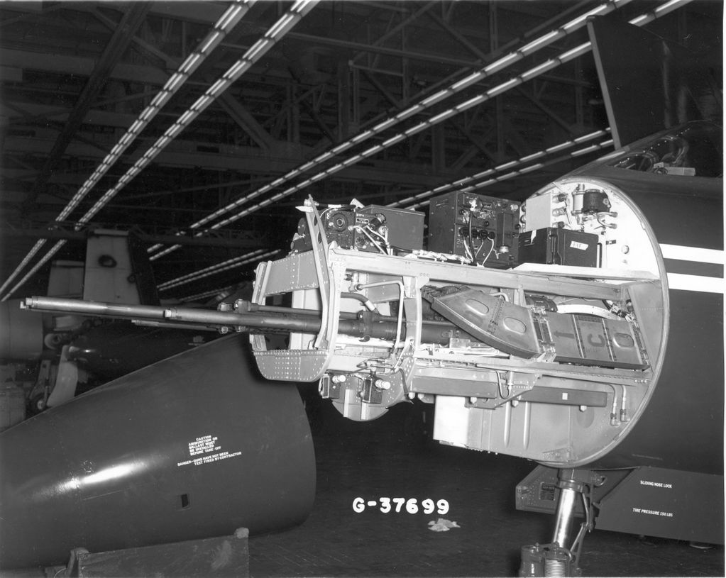 美国空军在1950年夏季试验过的F9F-3,机头有一个爱默生航空X17A横向旋转炮塔,装有4挺AN/M3,可向前半球范围内任意角度射击