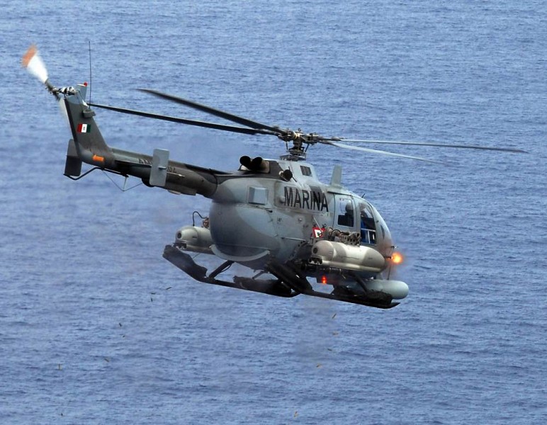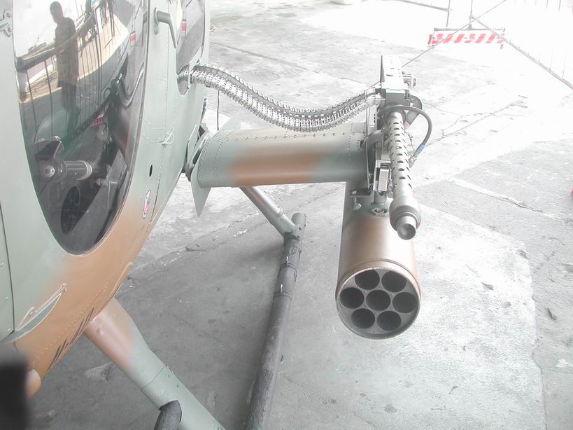 新的HMP250改进了枪口消焰器的设计,左图是吊挂HMP250的MD-520MG,右图是智利军队的MD530F
