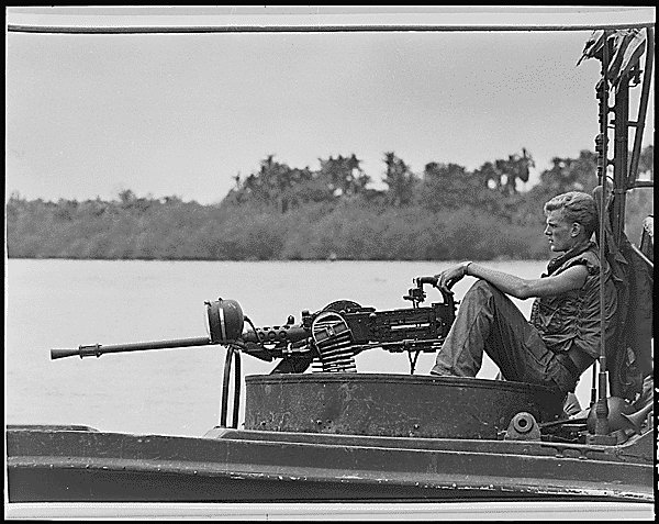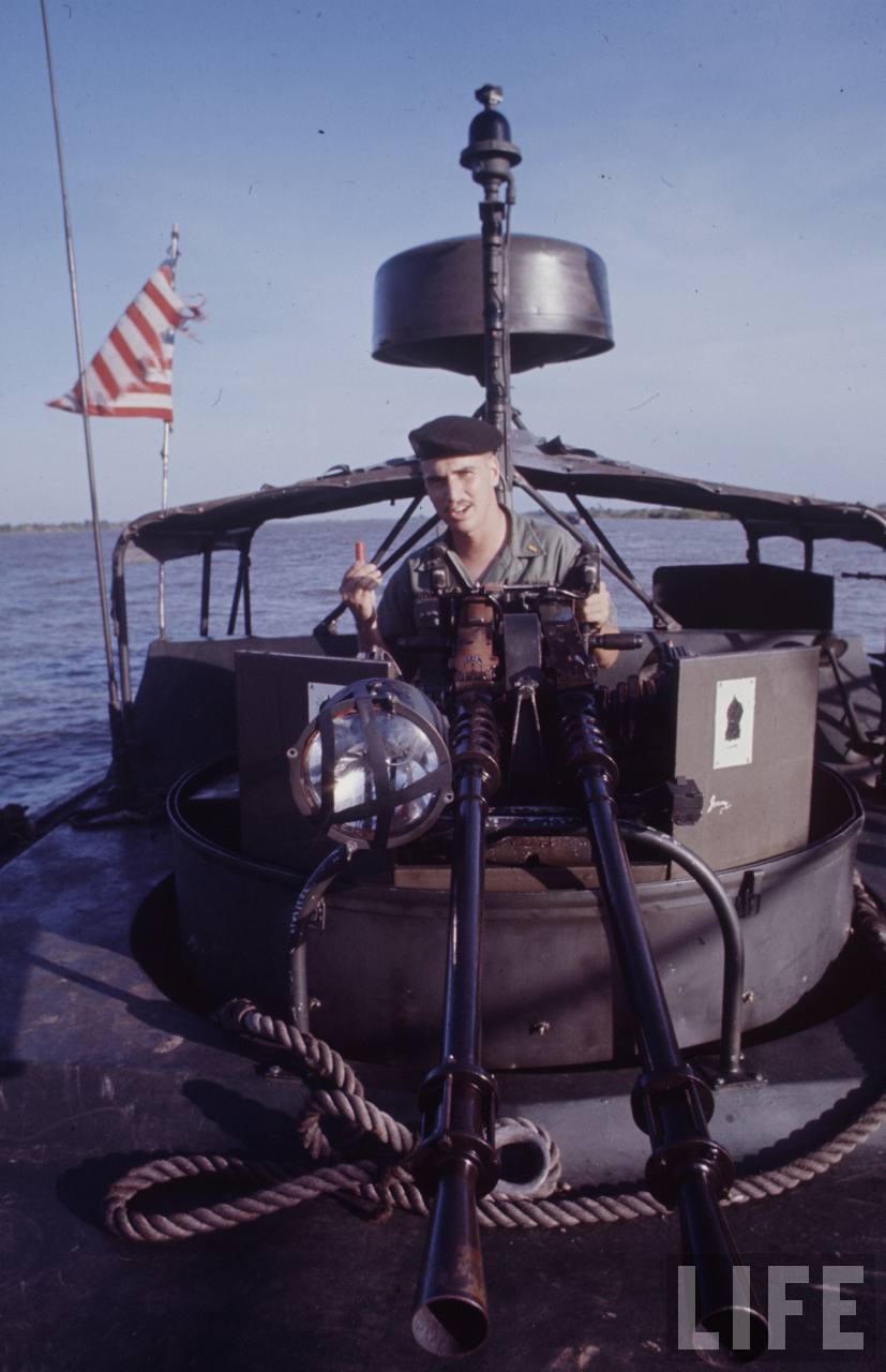 越战中美军内河巡逻部队早期使用的内可巡逻艇PBR Mk-I(Patrol Boat River),艇艏有双联M2HB,艇艉有一挺M2HB