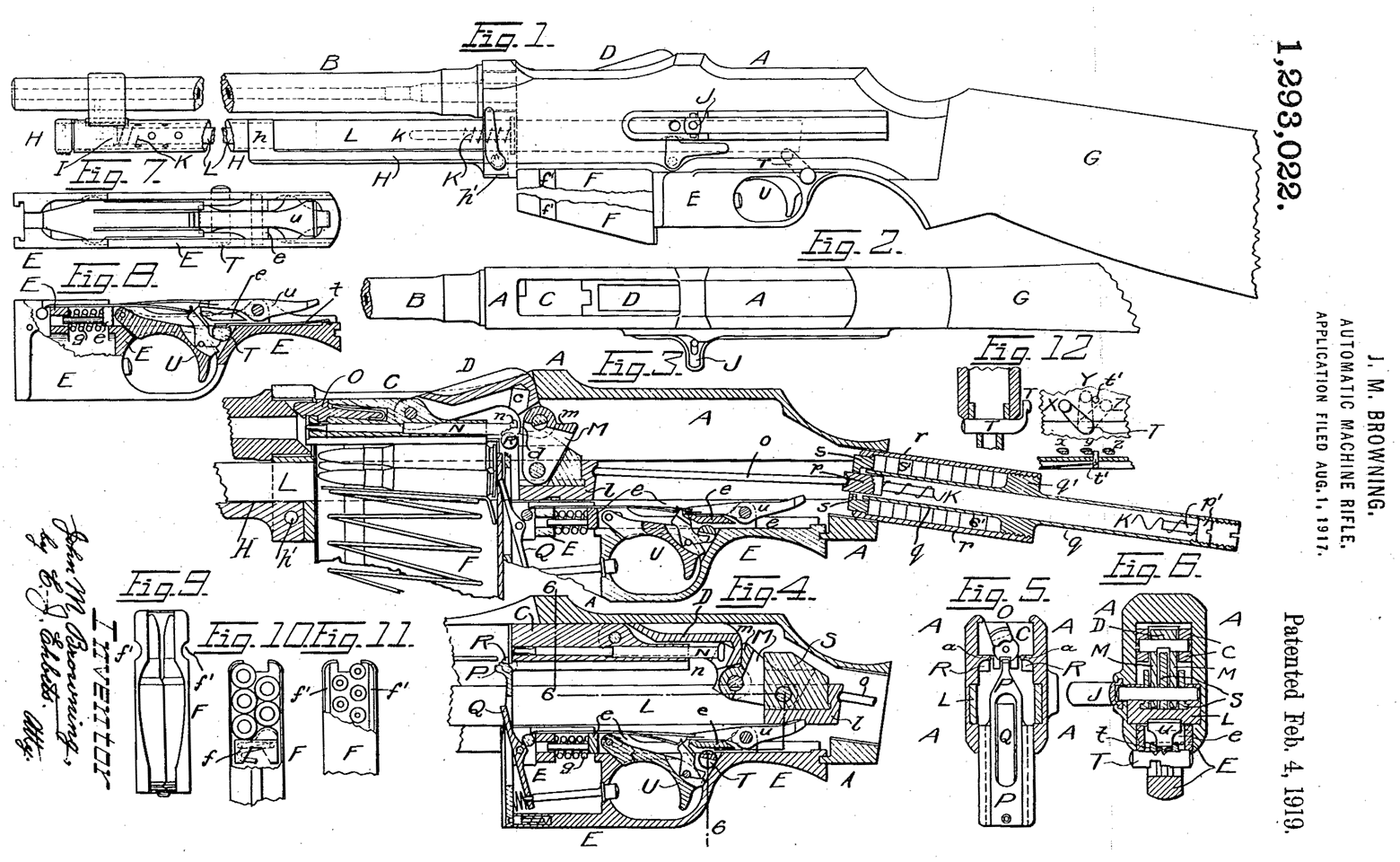 勃朗宁的BAR专利文件中的图纸,上面有专利号1,293,022