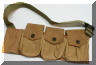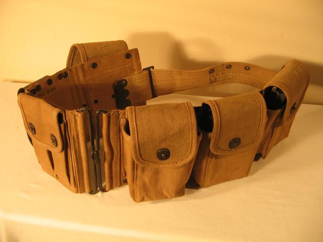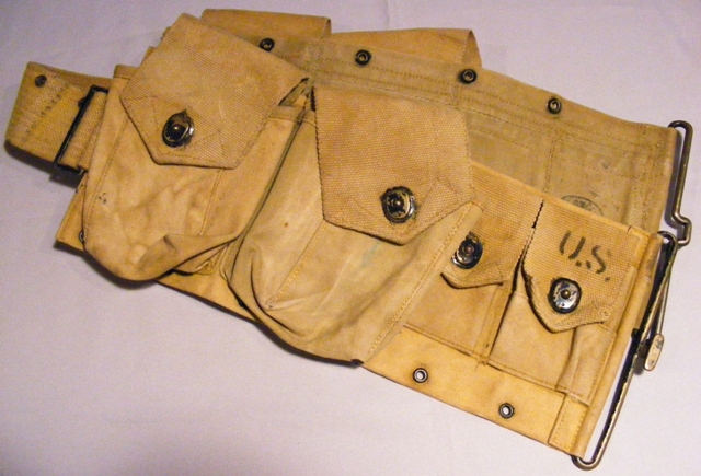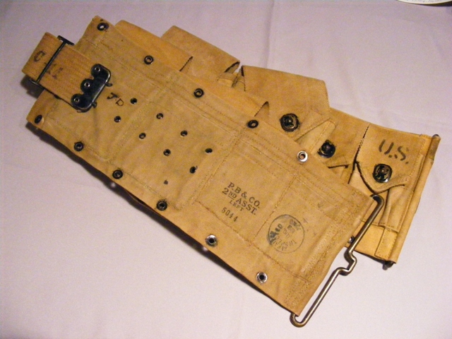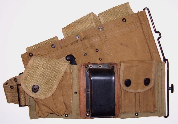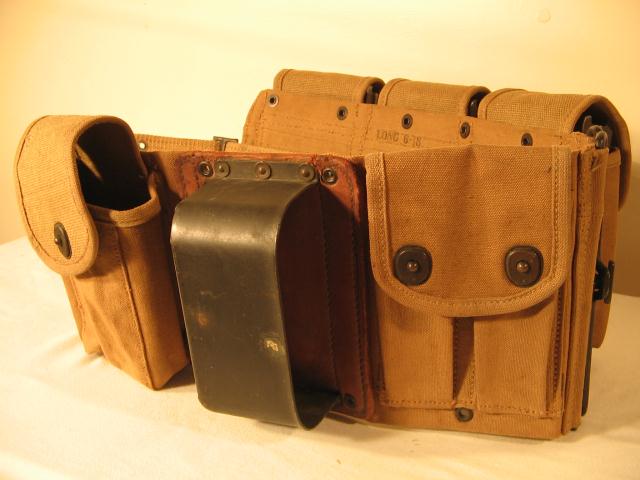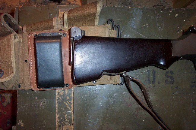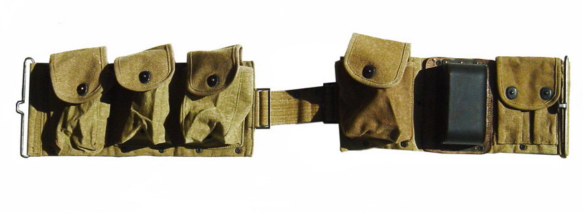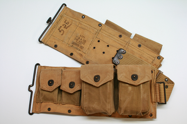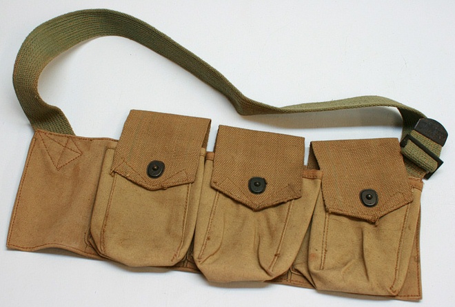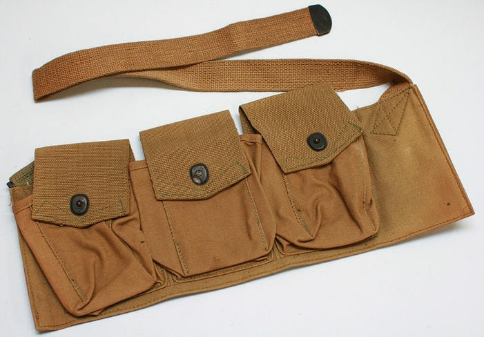 由于BAR是为步兵行进间射击而设计的,据说BAR曾配发过一种专门的子弹带,其右侧有一金属“杯”,可将枪托底部插入其中,以便射手能更轻松地实现“行进间射击”。BAR配的弹药携具有两种,一种是主射手用的挎包形式,左、右肩各背一个,每侧有3个弹匣袋,两个挎包共可携带12个弹匣。另一种是“副射手”用的,为腰带形式,有4个弹匣袋,每个弹匣袋中可装入2个弹匣,同时还有4个弹药袋可让携带8个春田步枪的桥夹。