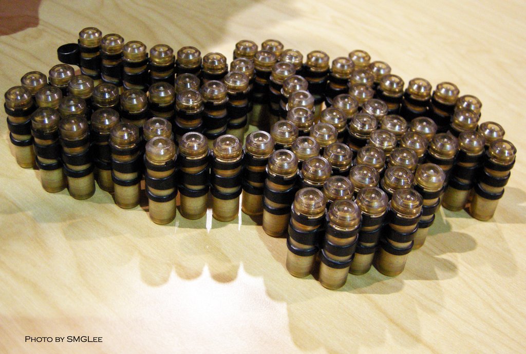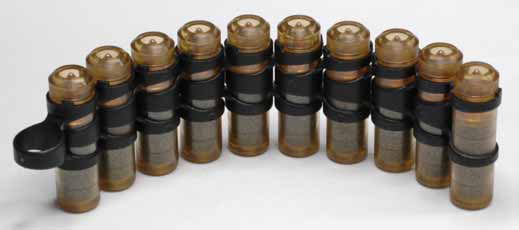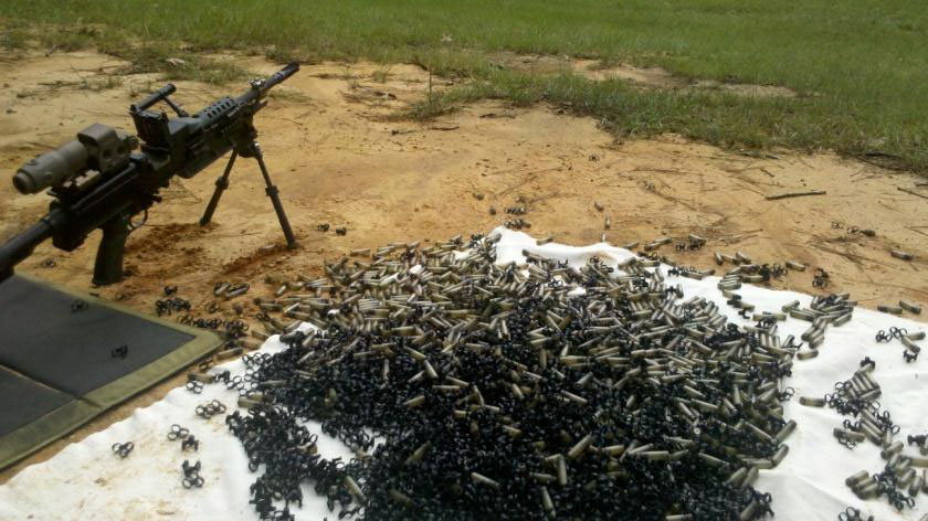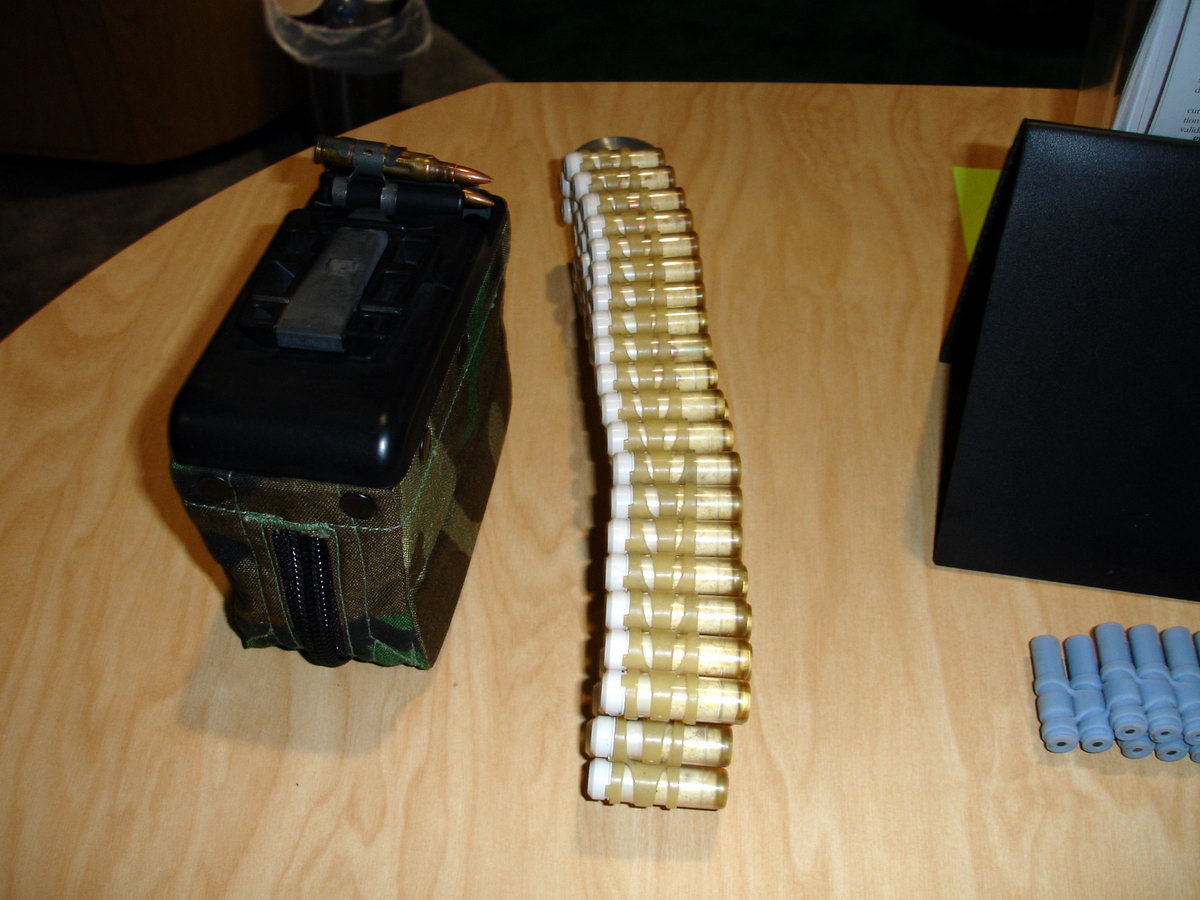 塑料壳埋头弹也被称为伸缩式弹壳(Case Telescoped),在项目中一般简称为CT。而无壳弹则简称为CL(Caseless)。CT弹已经经过了3个阶段的发展,目前的CT弹全重8.3克,塑料链节重0.5克。而5.56mm的M855弹则重12.2克,金属链节重2克。以一名机枪手携带600发弹链为例,M855弹共重9.4公斤,CT弹则共重5.8公斤。目前的CL弹重6.3克,如果同样为600发弹链,则全重4.6公斤。