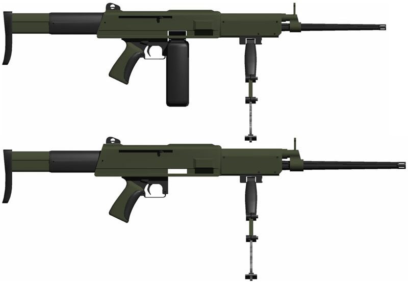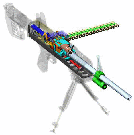 AAI集团由AAI公司牵头,参与研究方案的有阿雷斯(ARES)、BATTELLE、OMEGA及St. Marks Powder(通用动力公司属下)这4家公司。下图为AAI集团提供的概念图,图中上面的机枪为小口径的轻机枪型,下面的为中口径的中型机枪型。两种机枪都采用同样的、简单的操作原理,而且大部分零件可互换。