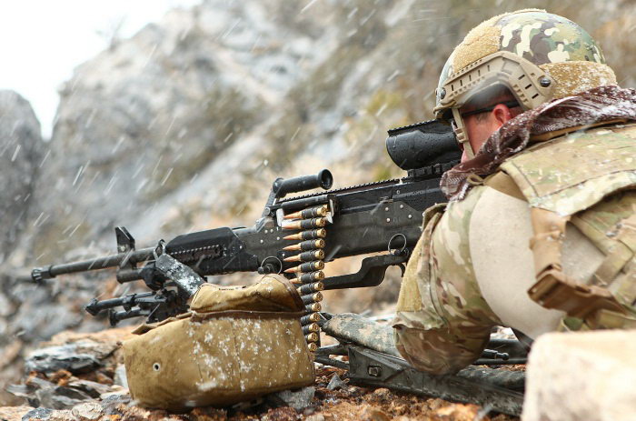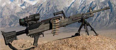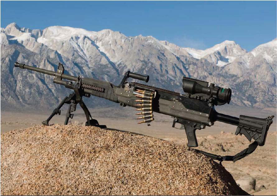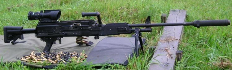 而且LWMMG相当轻,空枪重约10.9公斤,比M240B还轻了约1.3公斤,只比M240L略重。相对于.50 BMG口径的M2HB来说,LWMMG在重量和尺寸上的优势就更明显了。在弹药方面上也是一个优势,5发.338 NM弹的重量才相当于2发.50 BMG弹,但在反人员方面却有着相近的有效射程。所以LWMMG很适合徒步步兵携带,且远远地压制敌方的中型机枪,例如PKM。