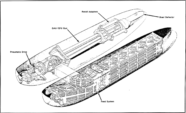 GAU-12/U是通用电气公司在1970年代末期,在GAU-8/A“复仇者”的基础上缩小而成。发射新的北约标准系列的25mm弹药。GAU-12/U采用一个15马力(11千瓦)电动机,并安装有气冷系统。它的最高射速可达4200发/分,但通常以3600发/分的射程使用。