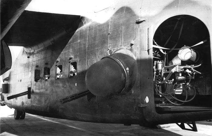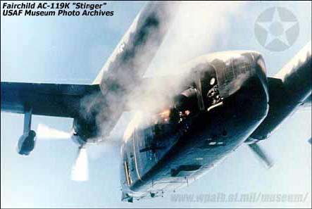 ![]() 这架AC-119K的M61机炮正在射击,左机翼下吊挂的短舱是J-85喷气式发动机 |
