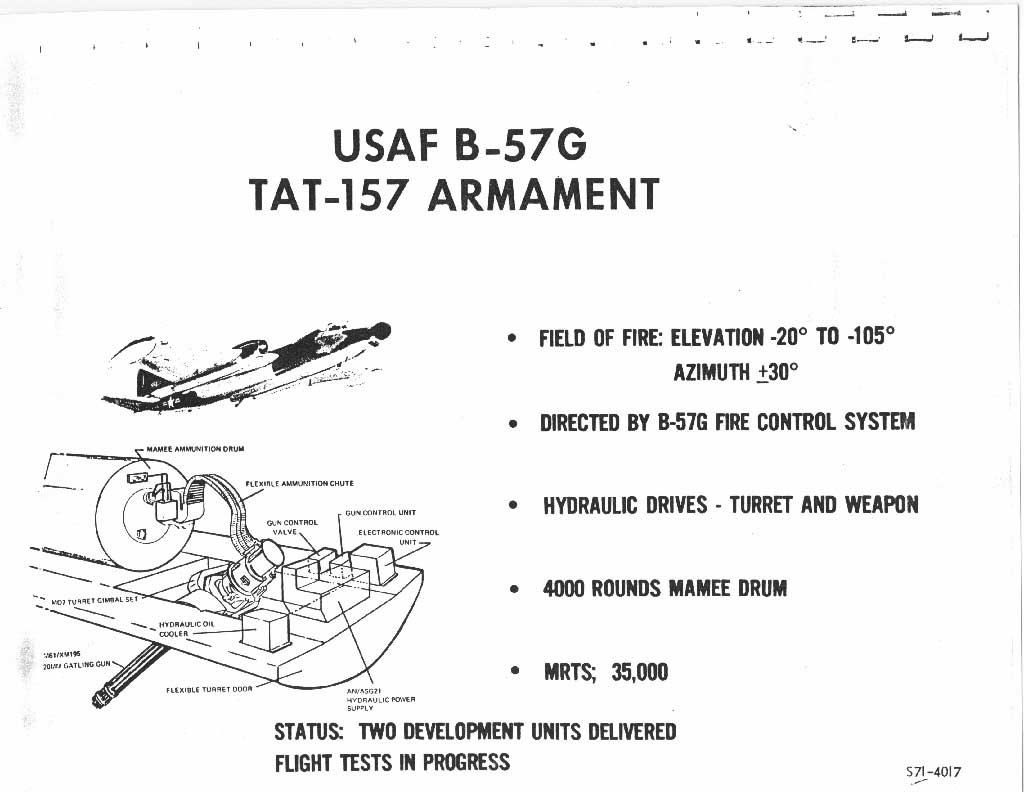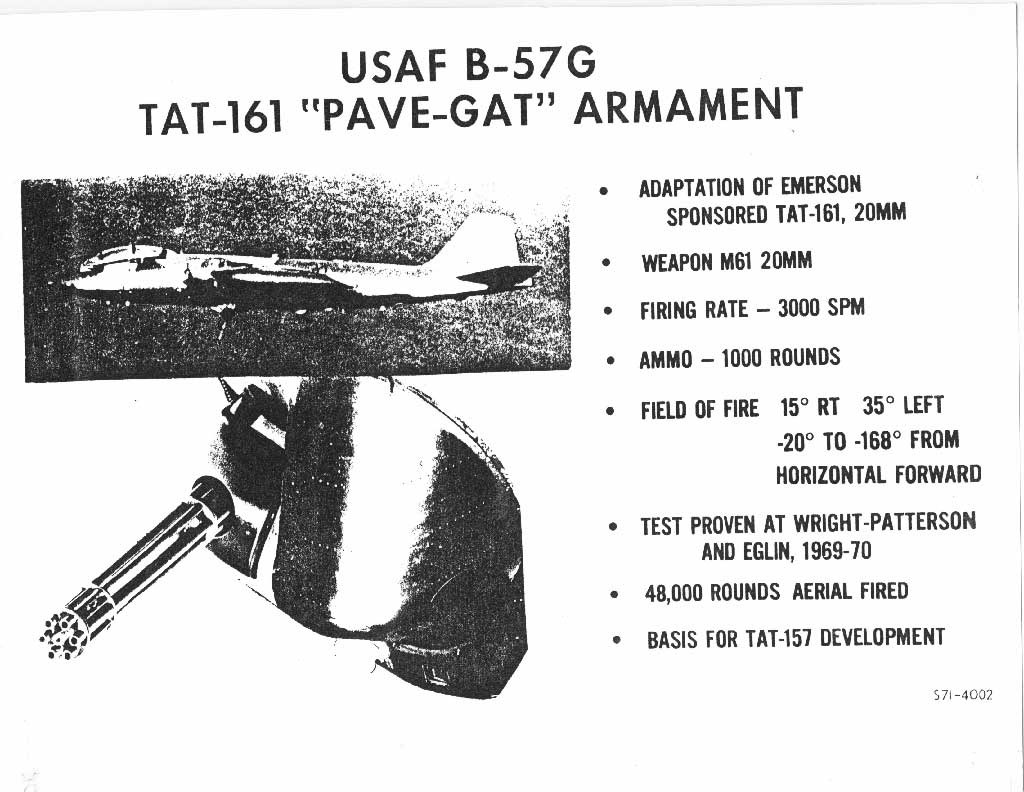 在B-57G轰炸机上试验过的一种安装M61A1的机腹炮塔,用于近距支援时扫射地面,先后有TAT-157和TAT-161两种炮塔