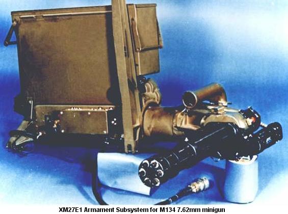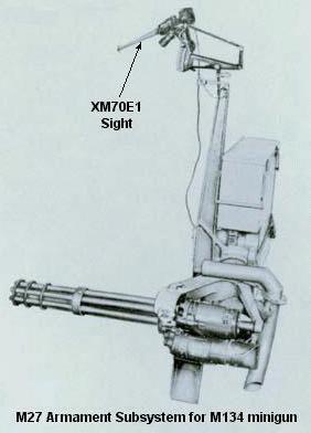 XM27E1直升机武装子系统是安装在OH-6A后舱左门使用的,在后舱有一个容量2,000发的弹药箱供弹。该武装系统用于取代配备M60C机枪的XM7武装系统。XM27E1也可作俯仰调整,由副驾驶通过一个反射式瞄准仪进行操控。后来定型为M27,也在OH-58A和OH-58C上安装过。