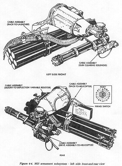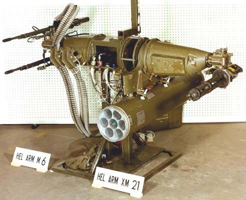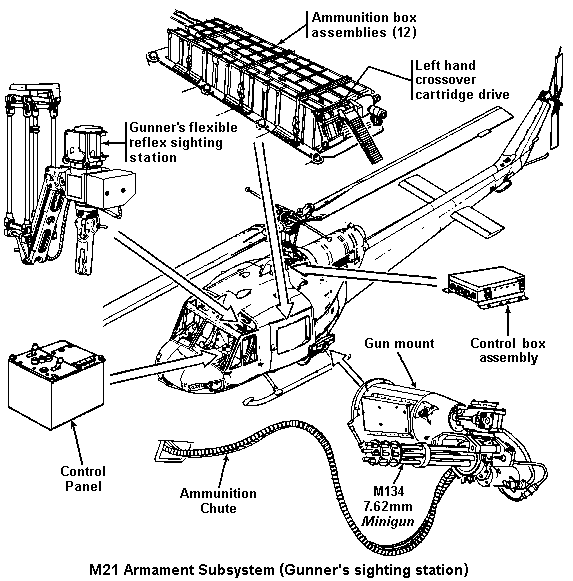 M21直升机武装子系统(M21 Helicopter Armament Subsystem)是专门安装在UH-1“休伊”直升机的机腹两侧使用的,每侧包括一挺可俯仰转动的M134和一个火箭吊舱。M21系统在越南大量使用,代替了原来配备两挺M60C的M6系统。早期的M21系统是安装在载员舱门的前方位置,但很快就改为安装在舱门后方位置。