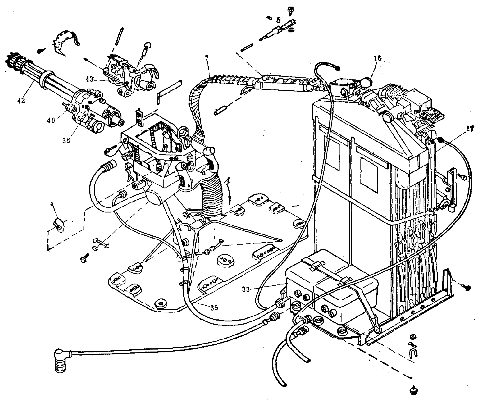 7-输弹道;16-输弹助推电机;17-弹箱;33-控制箱;35-底座(立柱、托架和摇架等);38-驱动电机;40-缓冲器;42-枪管;43-脱链供弹机。