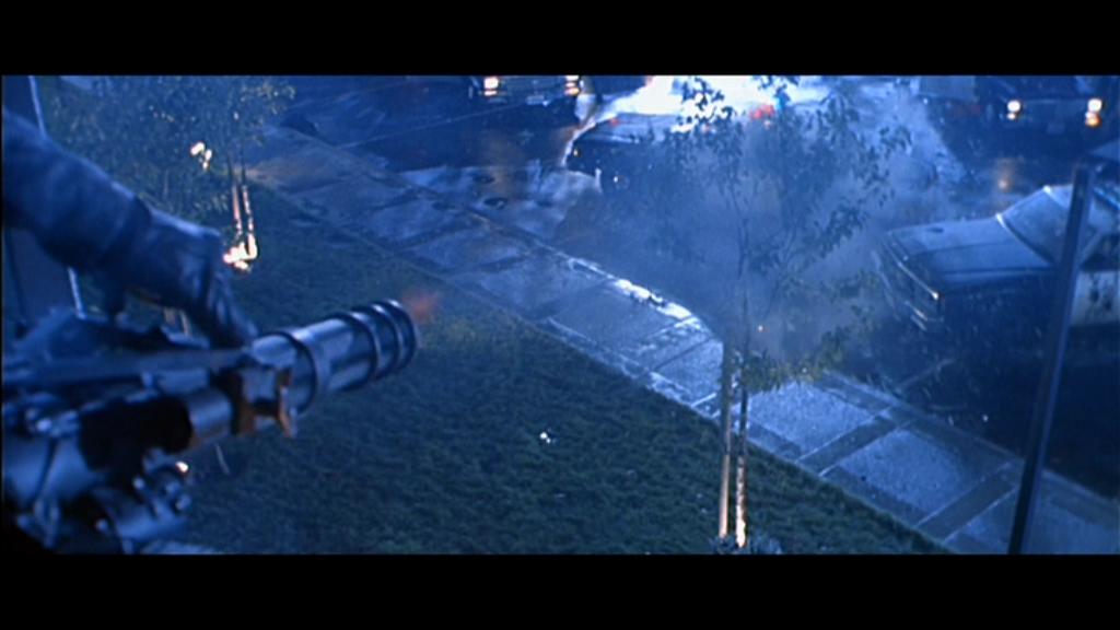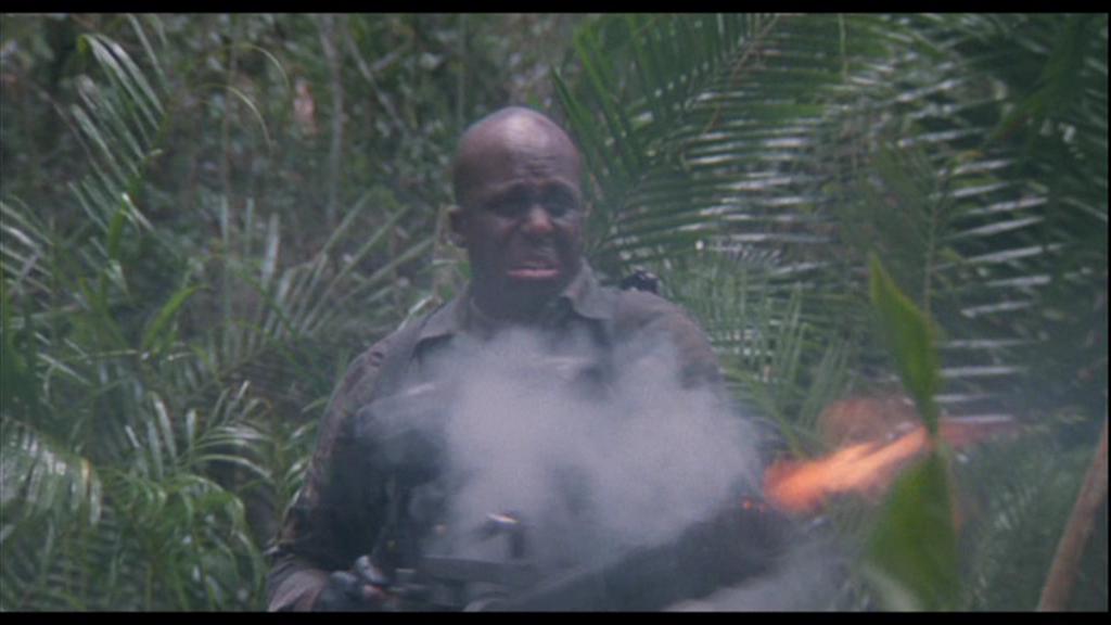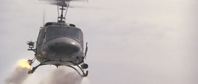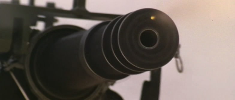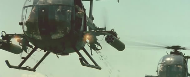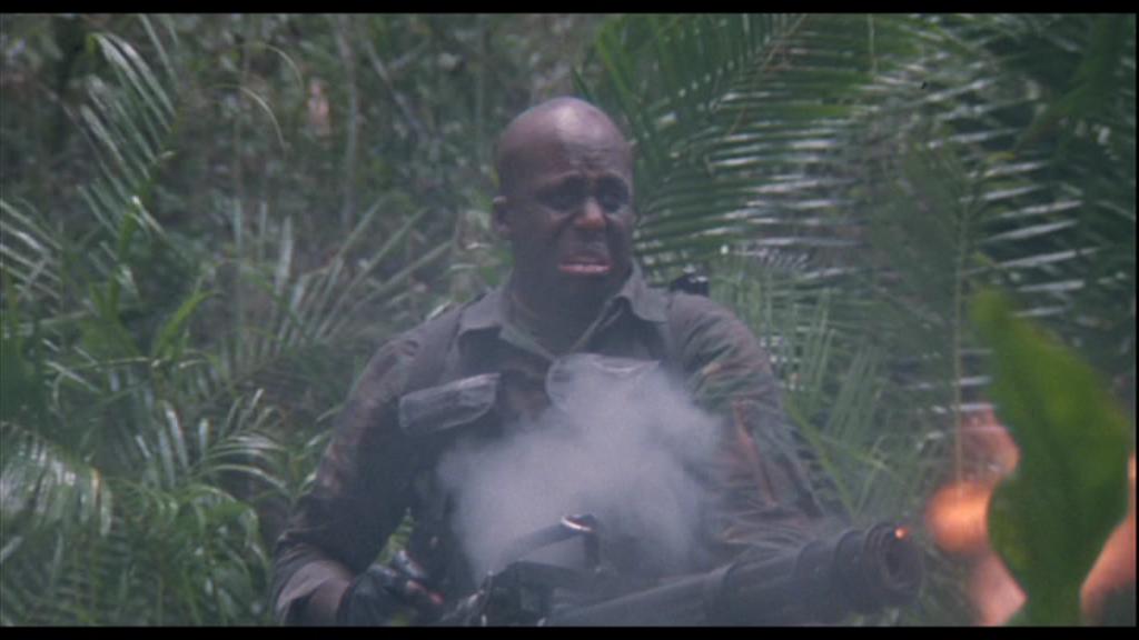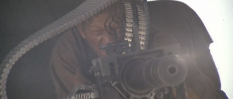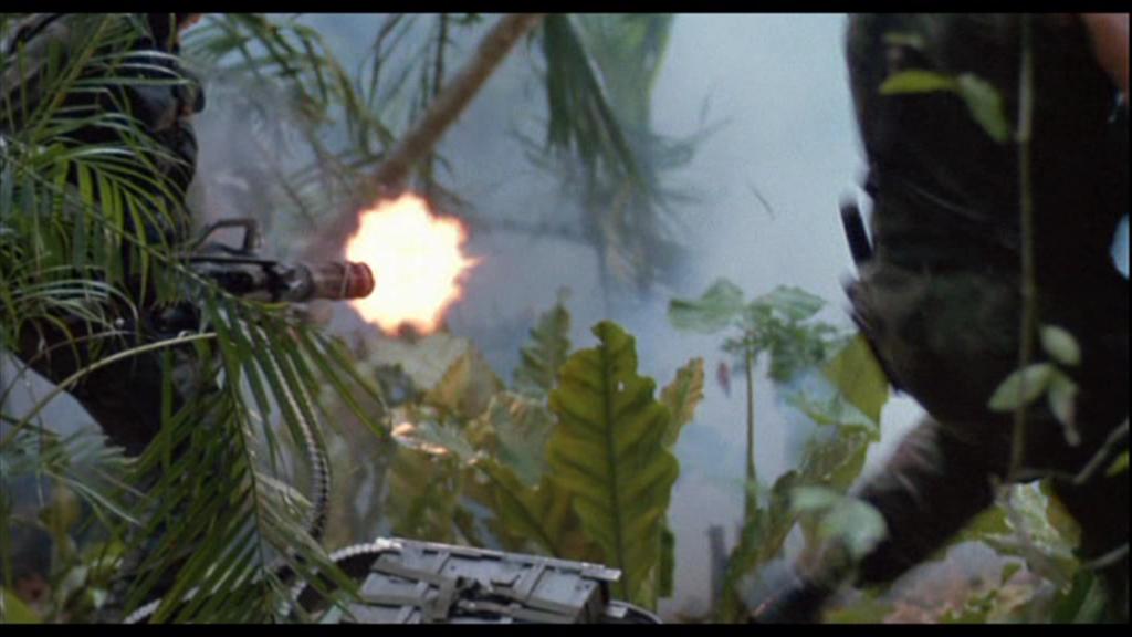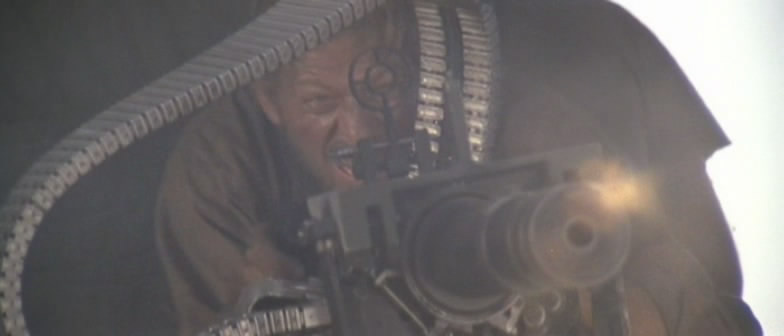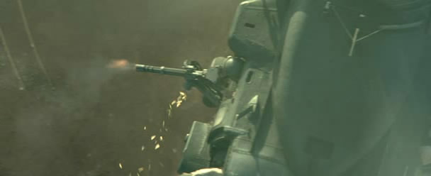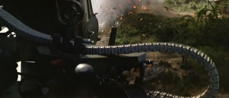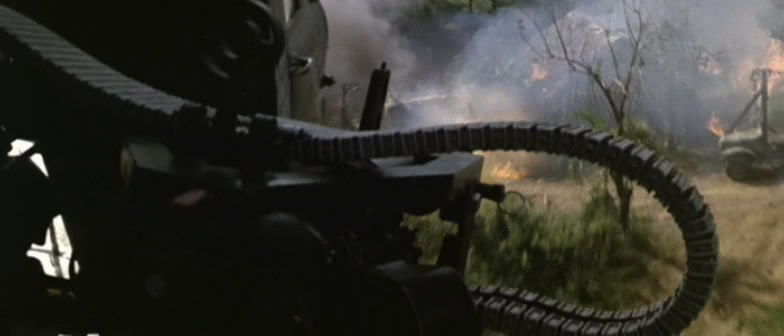 《兰博2》里面的M134一射击,被打中的跑龙套就和周围的树木一起同时被打中,突现出高速机枪的特点来。