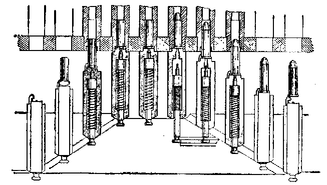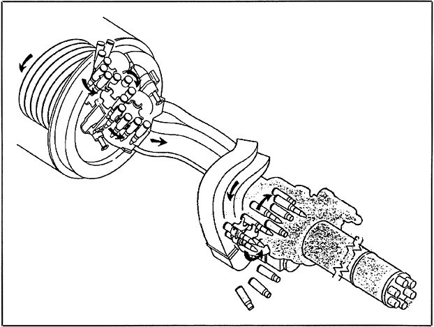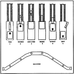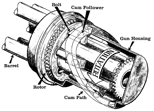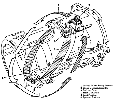 6根枪管的“火神”原型中的装填、击发、抽壳原理示意图,虽然具体设计不同,结构上也复杂了许多,但这方面的原理与加特林机枪是完全一样的