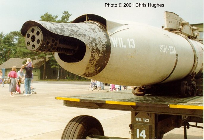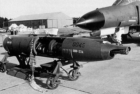 SUU-23/A机炮吊舱由SUU-16/A机炮吊舱改进而来,因此外形很相似。SUU-23/A可携带1,200发M50系列炮弹,装满弹后全重780kg,采用单回路无链供弹系统供弹。虽然GAU-4/A的理论射速最高可达6,000发发/分,但SUU-23/A机炮吊舱一般是调到5,400发/分。SUU-23/A系统总重比SUU-16/A要大,但由于SUU-16/A的空气涡轮发动机不能在低速飞行中使用,因此SUU-23/A的应用场景更广泛。然而由于依靠内能源驱动炮管转动和供弹装置的动力不太够,所以经常会出现故障。