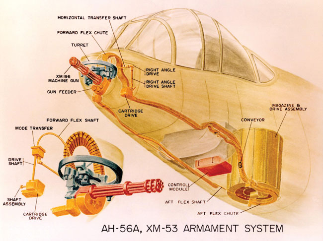 XM196机枪是GAU-2B/A(M134的美国空军型号)的改进型,主要是改进了抛壳装置,是专门为AH-56“夏延人”直升机项目研制的,原计划中,火力强大的AH-56直升机有多种武器,包括机腹的30mm链式机炮和机鼻下方的小炮塔,机鼻小炮塔可选用的武器有两种,一种是配备XM129榴弹发射器的XM51武装系统,另一种就是使用XM196机枪的XM53武器系统。