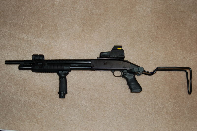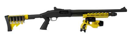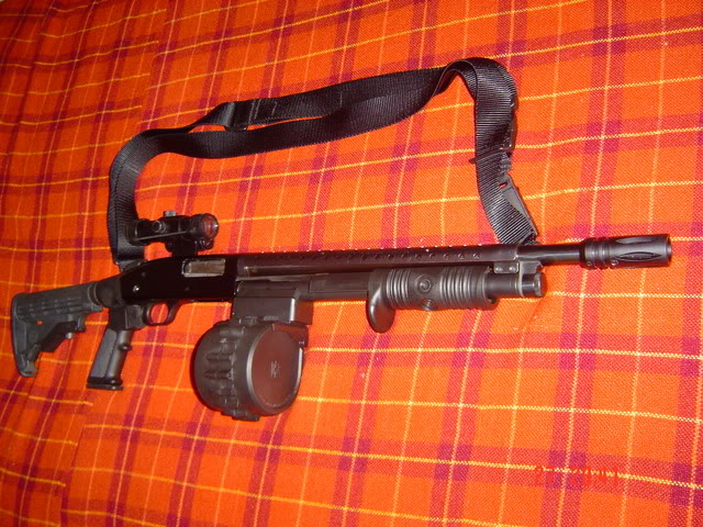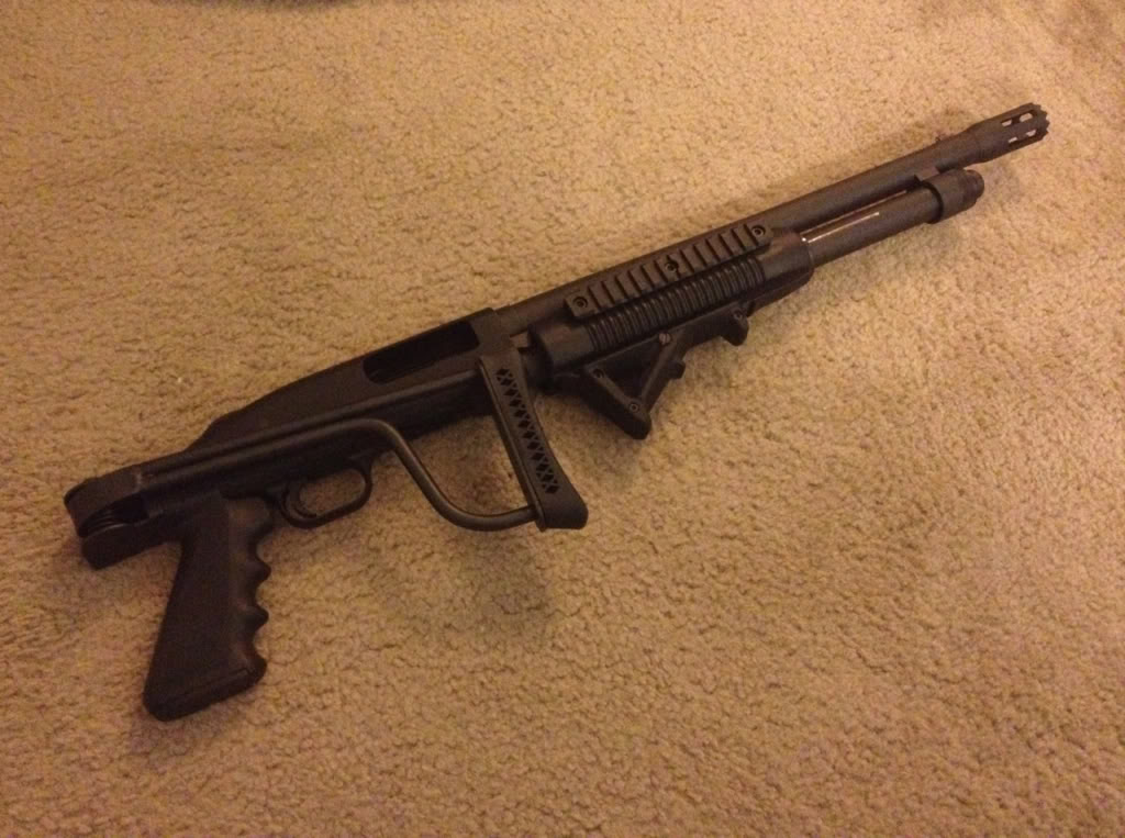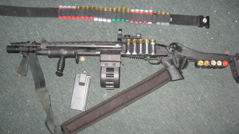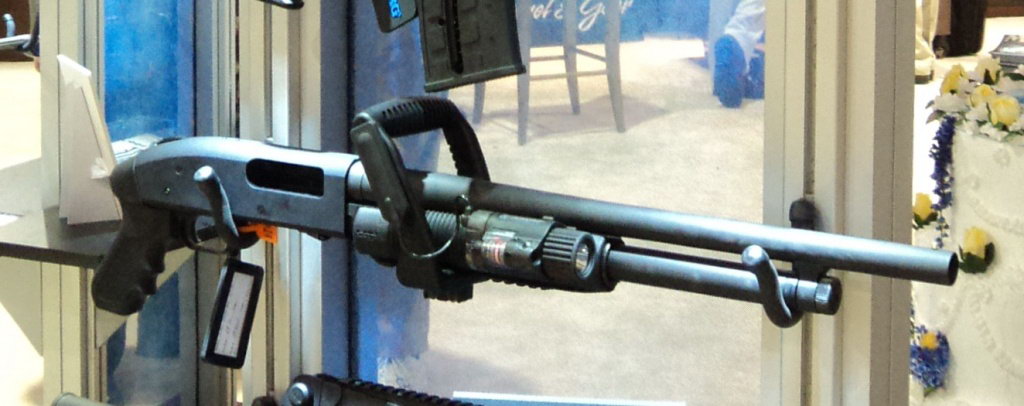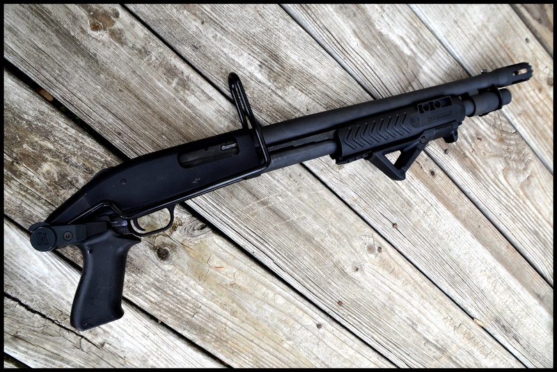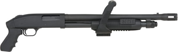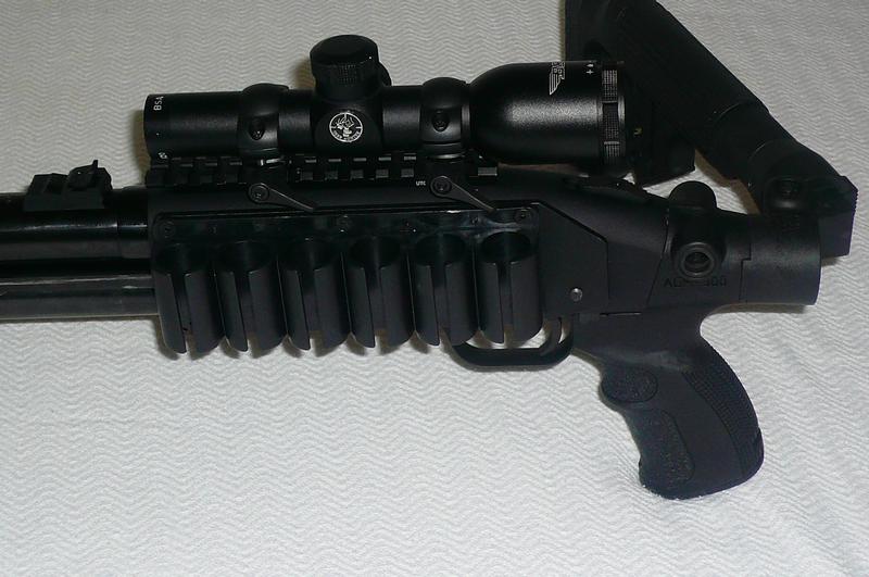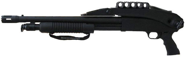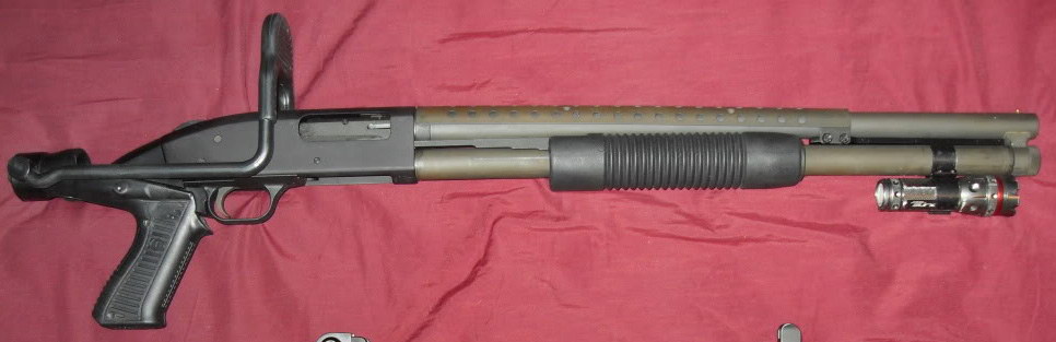 这种叫“电锯”型(Chainsaw)的莫斯伯格500其实就是把一个提把装到三导轨型的下导轨上,用提电锯的方式持枪,完全是一种噱头型号