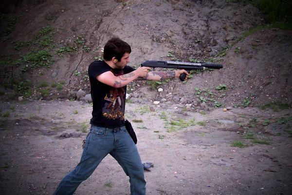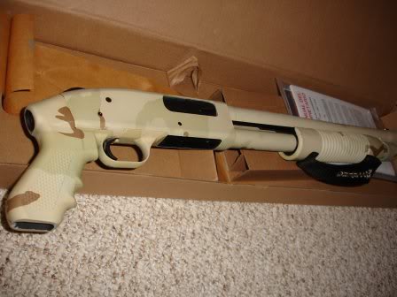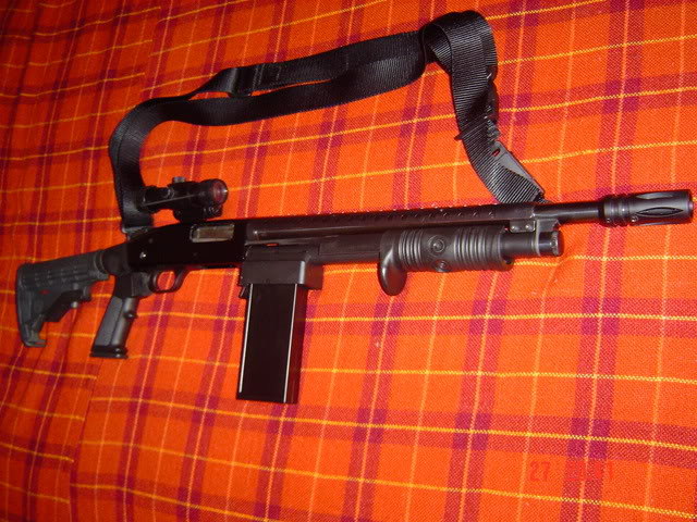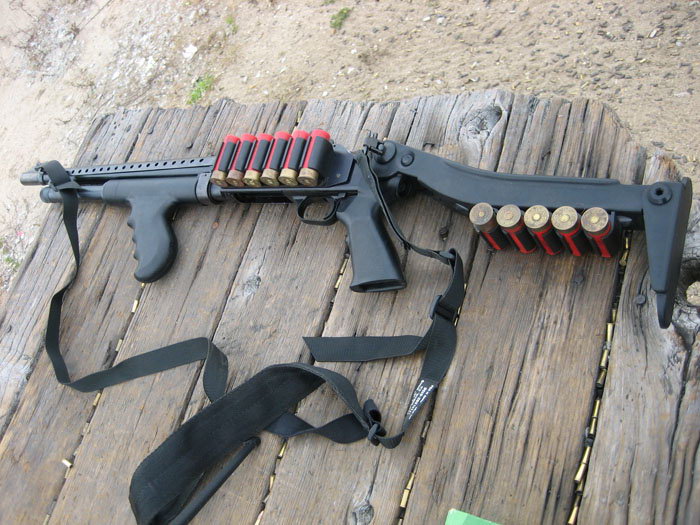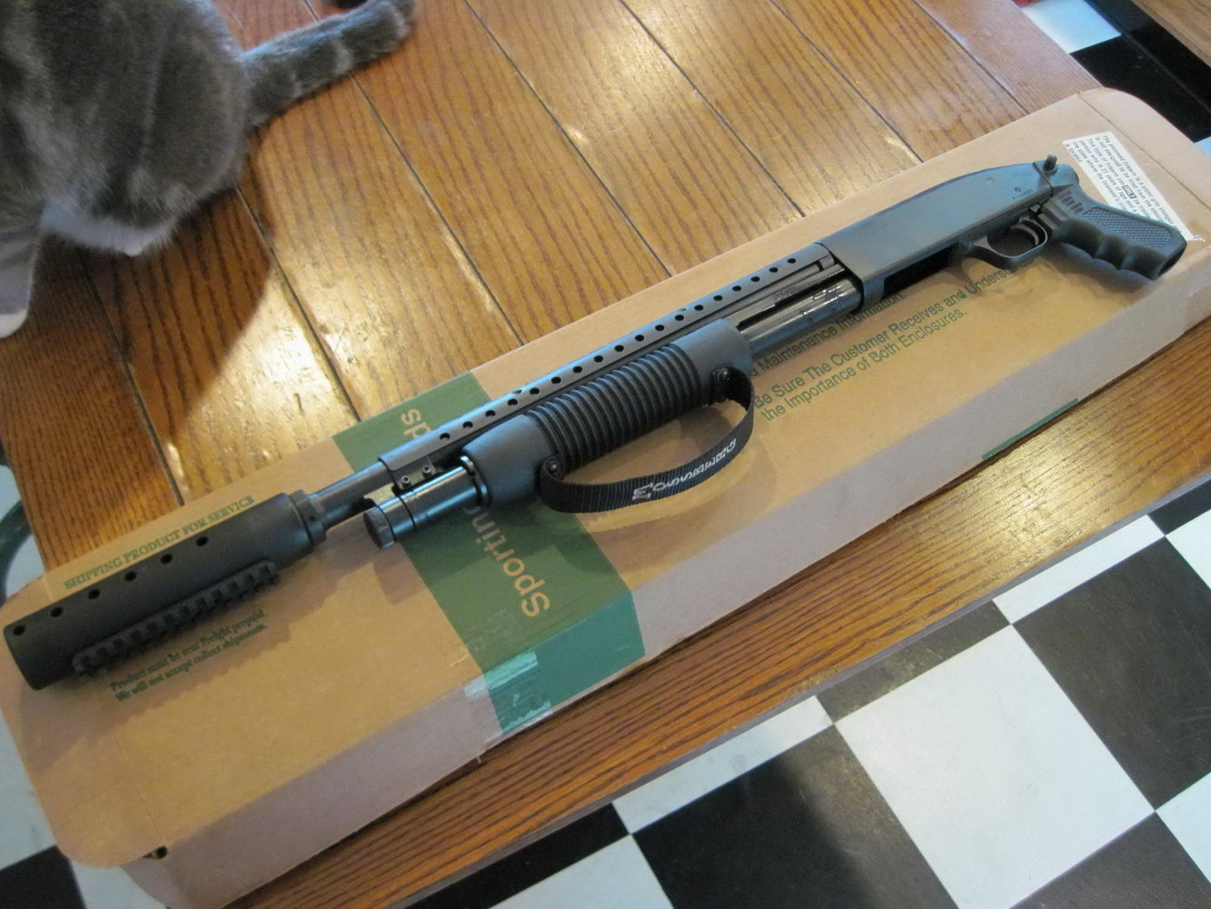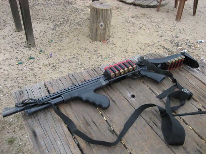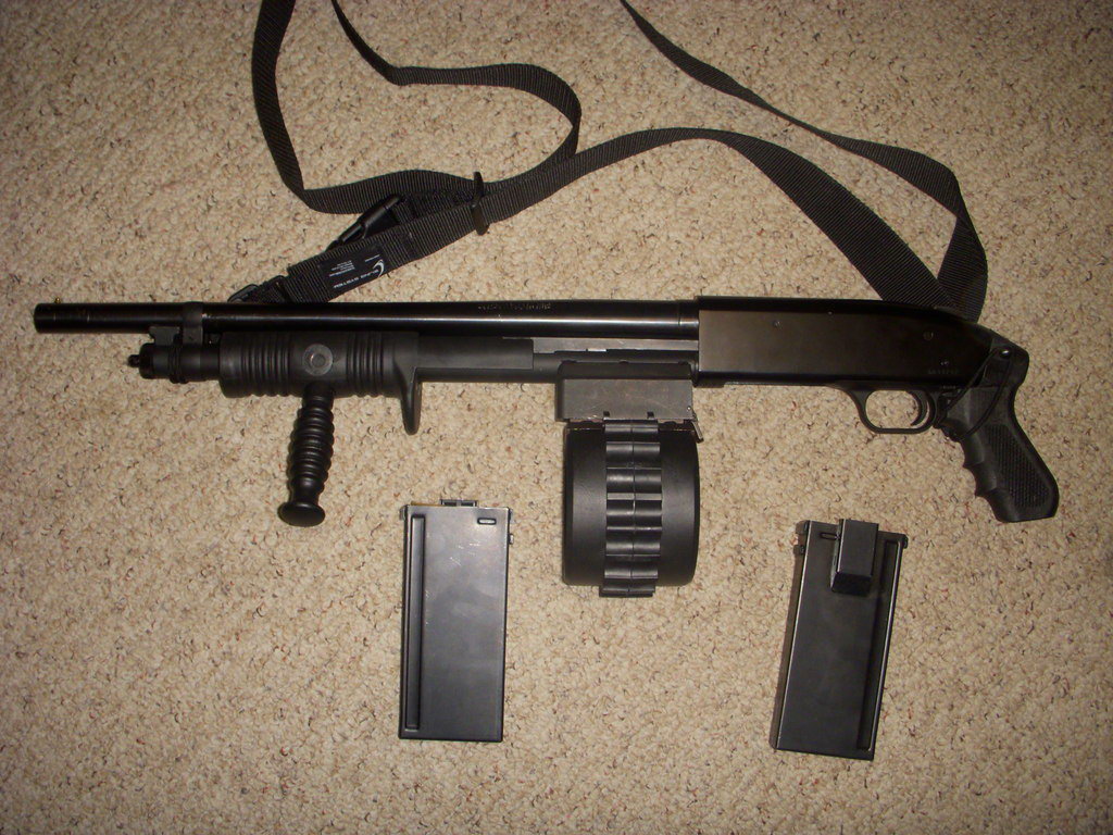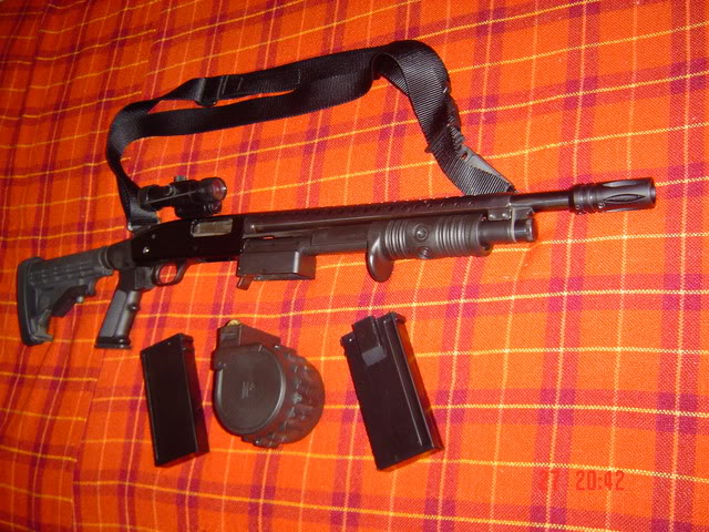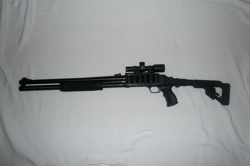这种叫“电锯”型(Chainsaw)的莫斯伯格500其实就是把一个提把装到三导轨型的下导轨上,用提电锯的方式持枪,完全是一种噱头型号