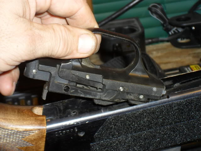 扳机组包括扳机、击锤、阻铁,装在连同护圈的扳机体上,只要卸出机匣上的一个定位销和向下拉扳机护圈就能拆出来(如果使用手枪形握把,则需要先取出握把,否则握把会妨碍扳机组的拉出)。
