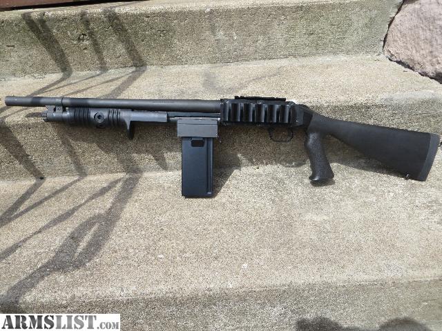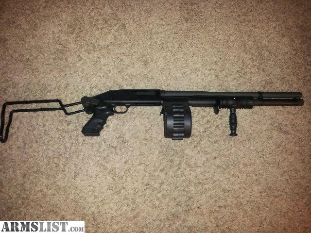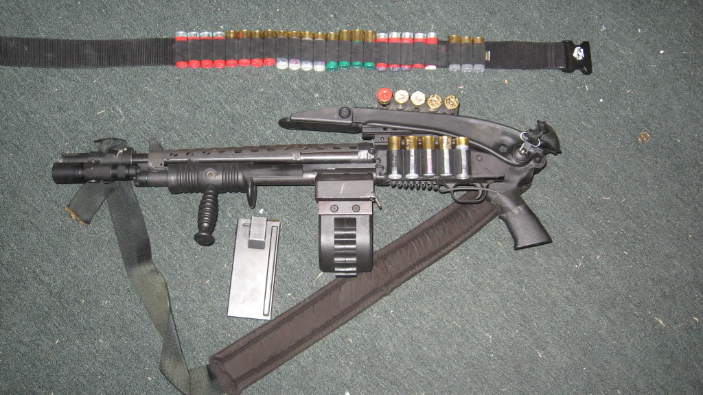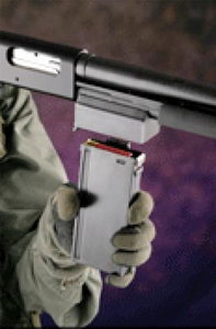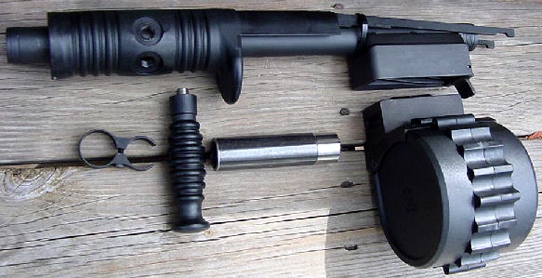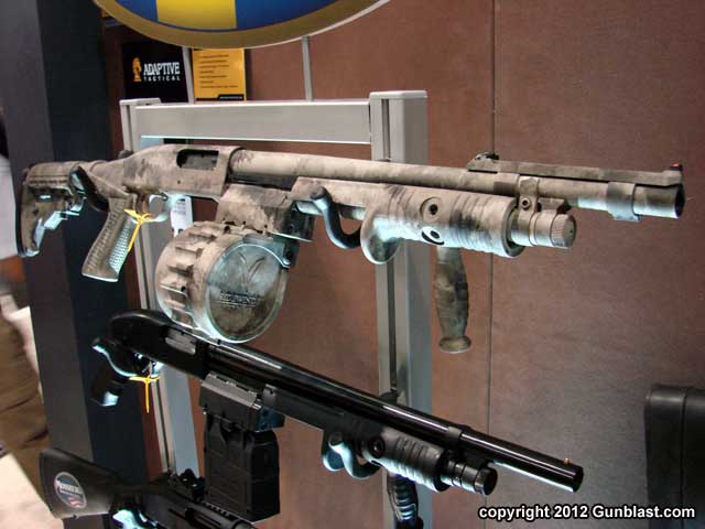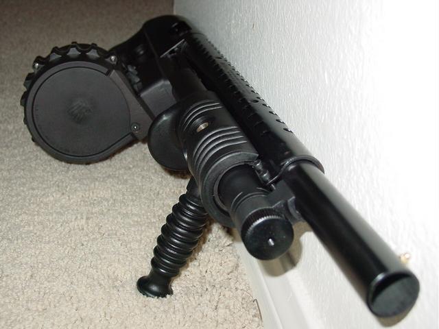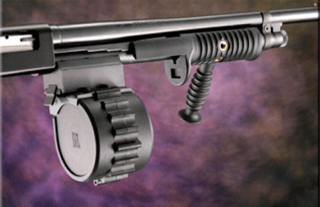 这个比较有意思,是一种叫Knoxx sidewinde的可卸弹匣改装,可使用盒形弹匣和大容量弹鼓,由于弹鼓的尺寸太大会妨碍推拉泵动手柄,因此改装套件中包括了一个安装在泵动手柄上的侧向握把,可按自己习惯选择安装偏向左侧或右侧
