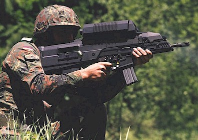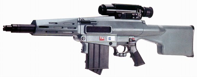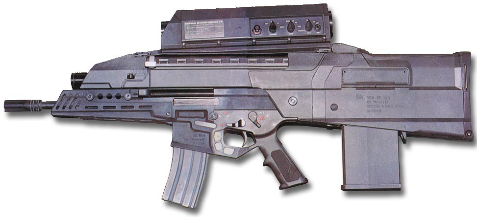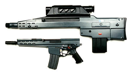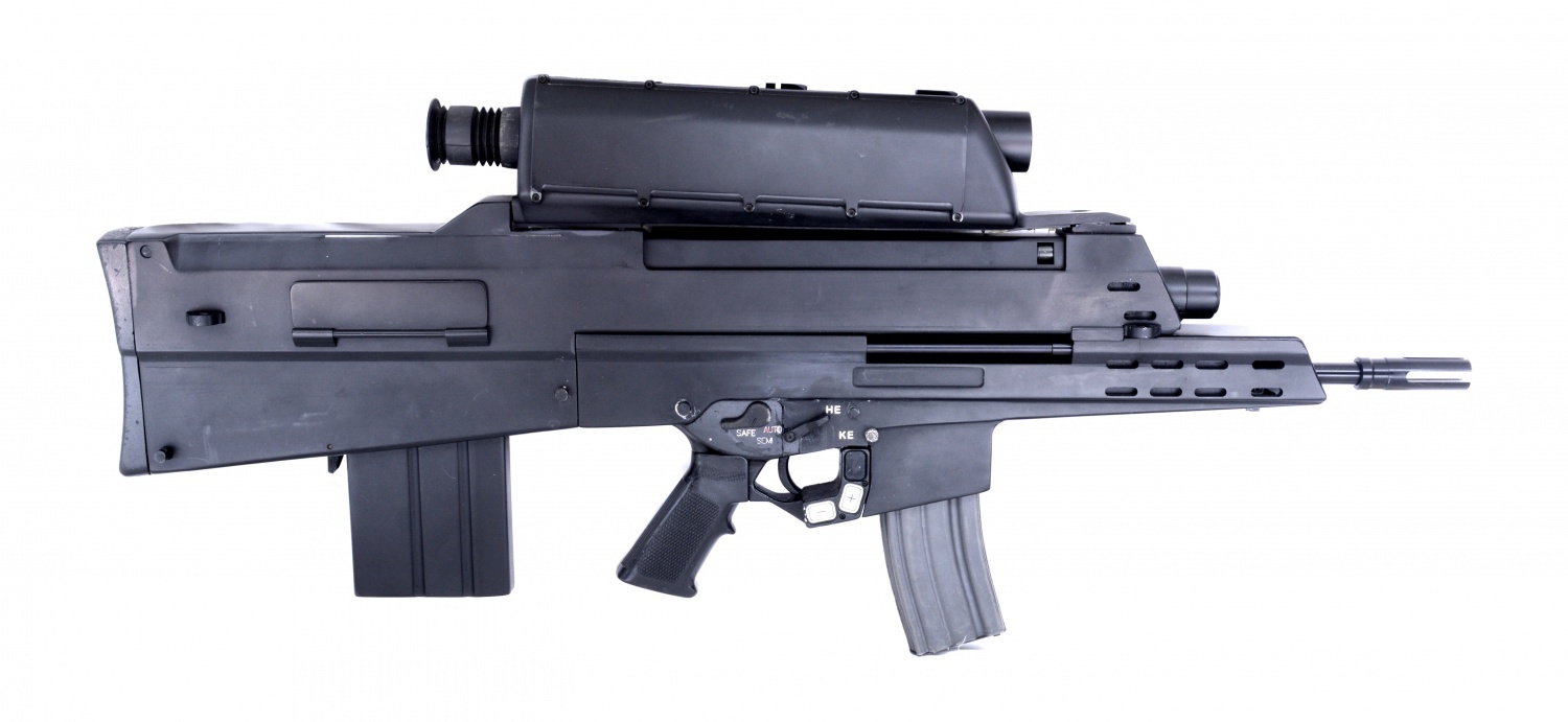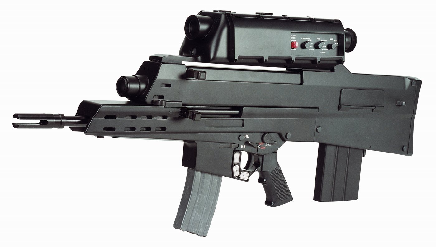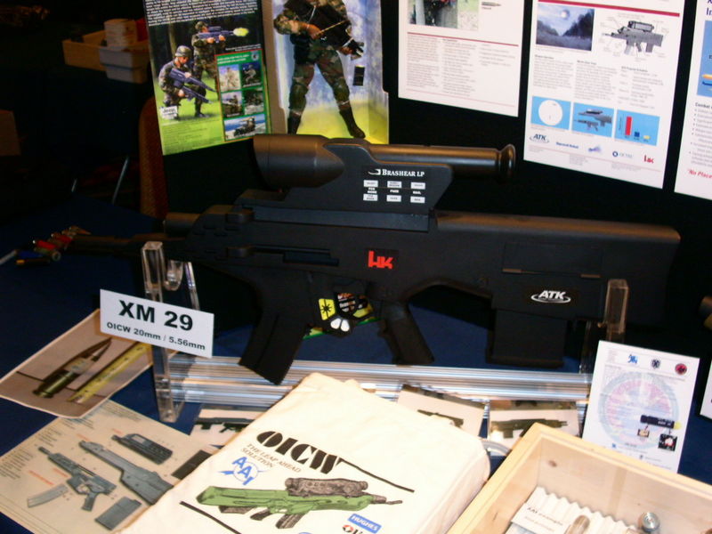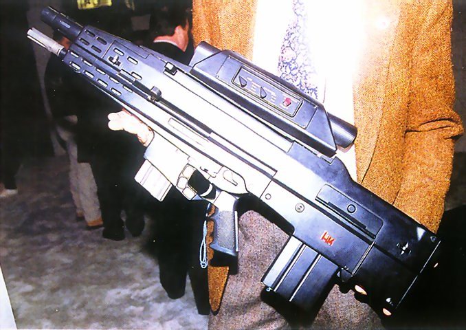 1996年2月,HK公司开发出第一个可以发射的OICW原型(上图),当时HK公司开发的OICW采用有别于AAI集团的OICW原型,采用的是左右两管并排的结构。后来又作了一些改动,将20mm榴弹的弹匣后移到与5.56mm步枪弹匣并列(下图)。