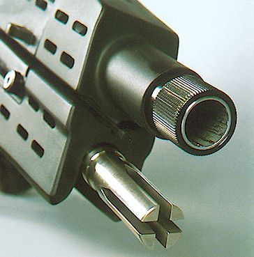 动能(Kinetic Energy)武器模块,简称KE。按照美军的要求,动能武器模块要使用M16的20发和30发通用弹匣,加上HK公司样枪的握把与M16的一样,枪口安装的刺刀又是M16所用的M9,所以看起来好像也是M16系列的衍生型。其实HK公司的步枪部分是以G36系统为基础改进而成的,但由于步枪枪管上方要安装20mm枪管,原有的导气管会使增加枪的高度,所以HK公司把导气管改为左右两根,导气管与拉机柄位于枪管侧面,与枪管呈45角左右枪管长240mm,2层结构,内层是钢,外层是钛,压套在内管上。这种枪管结构极少用于轻武器,虽然工艺复杂、生产成本高,但可以大幅减轻重量。另外,G36的枪机部分基本没有变。
