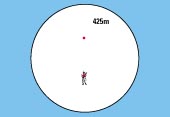 | 以上图为例,将瞄准具目镜上的红点对准目标,按下激光测距按钮,就显示出目标的距离(425米),同时还出现另一个红点,它标示出在425米距离上20mm高爆弹的弹着点,这样射手就可以根据这个提示,抬高枪口,使标示弹着点的红点叠在目标身上。当然,如果采取空炸模式,则可以将红点再抬高到目标上方1~2米处。 |